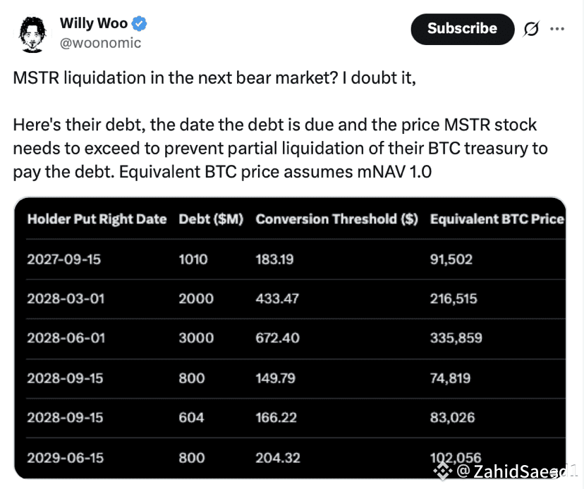 According to Woo, the company’s next major debt milestone comes on September 15, 2027, when around $1.01 billion will be due. For MicroStrategy to avoid selling any Bitcoin at that point, its stock price needs to stay above $183.19, which roughly aligns with Bitcoin trading around $91,500 — assuming a 1x multiple to net asset value (mNAV).