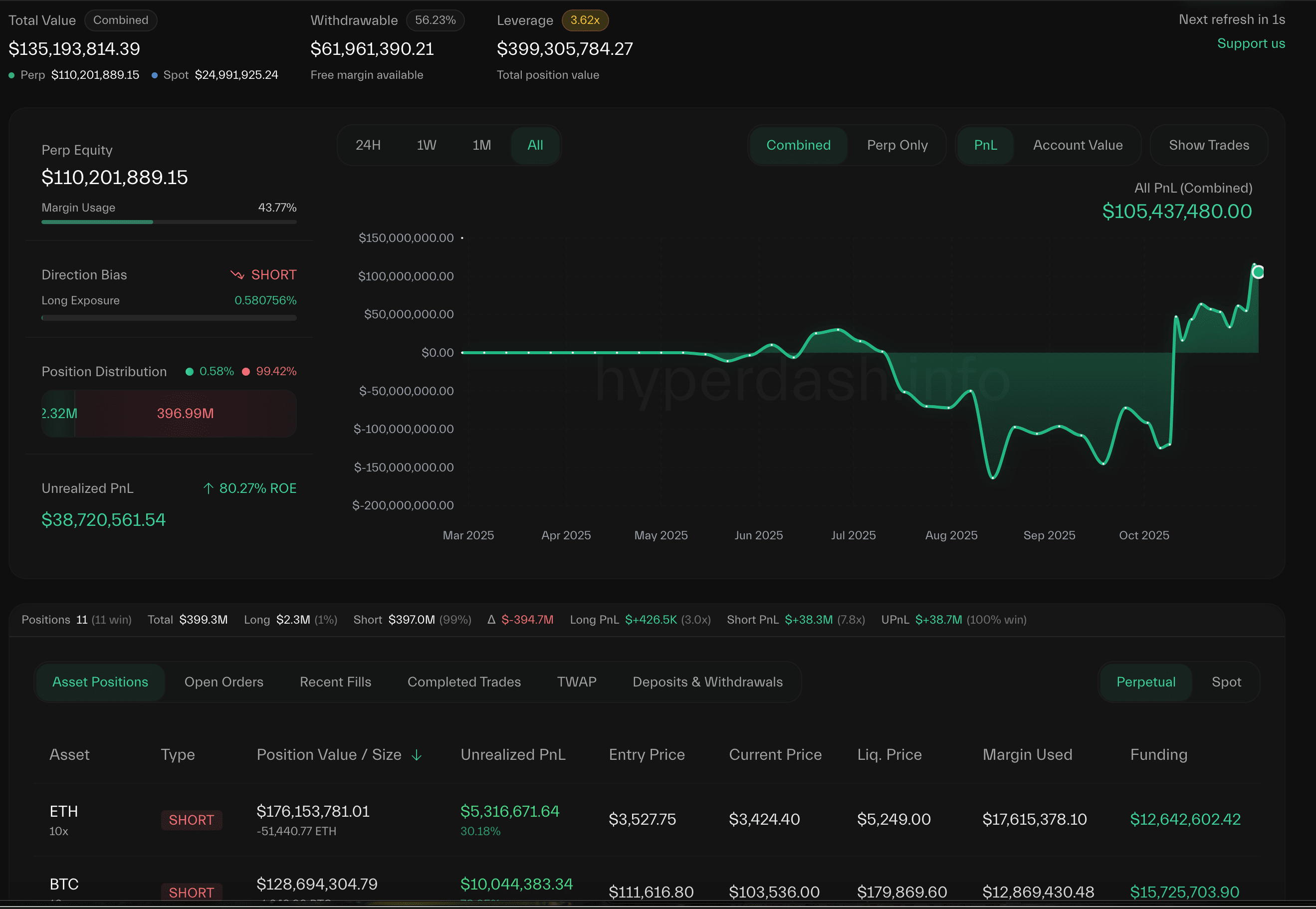 À une époque où la plupart des traders ont du mal à rester rentables, un trader anonyme vient de publier un PnL total époustouflant de 105 437 480 $ — et le monde de la crypto ne peut pas s'empêcher d'en parler.