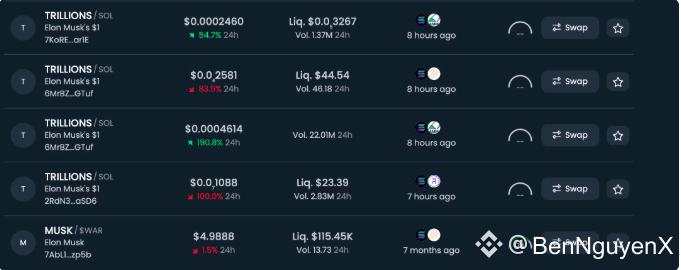 🔹 Cơn sốt memecoin: Chỉ trong vài giờ, hàng loạt token mới với các tên gọi như "TRILLIONS", "Elon’s $1", và "MUSK" đã xuất hiện ồ ạt trên các blockchain như Solana, Ethereum và BNB Chain.