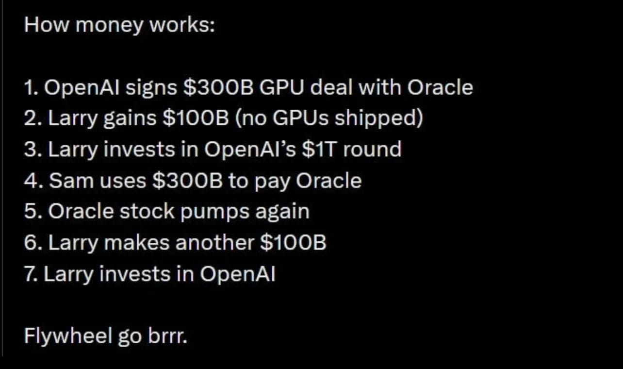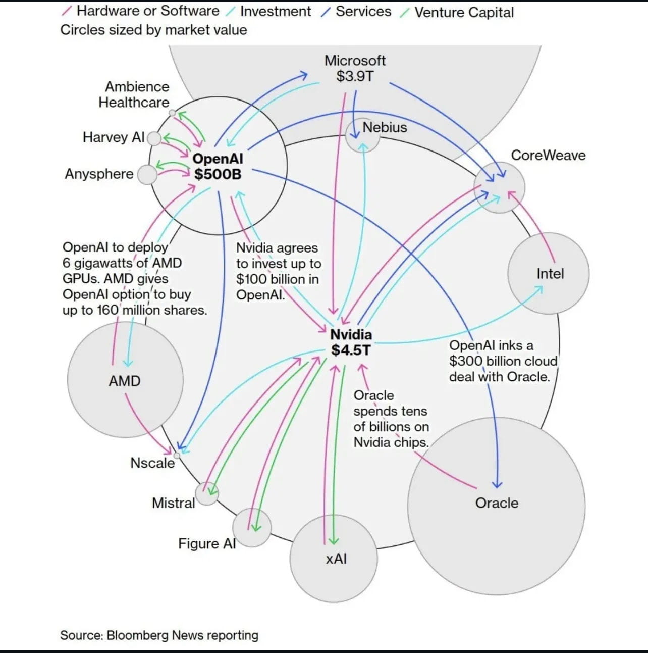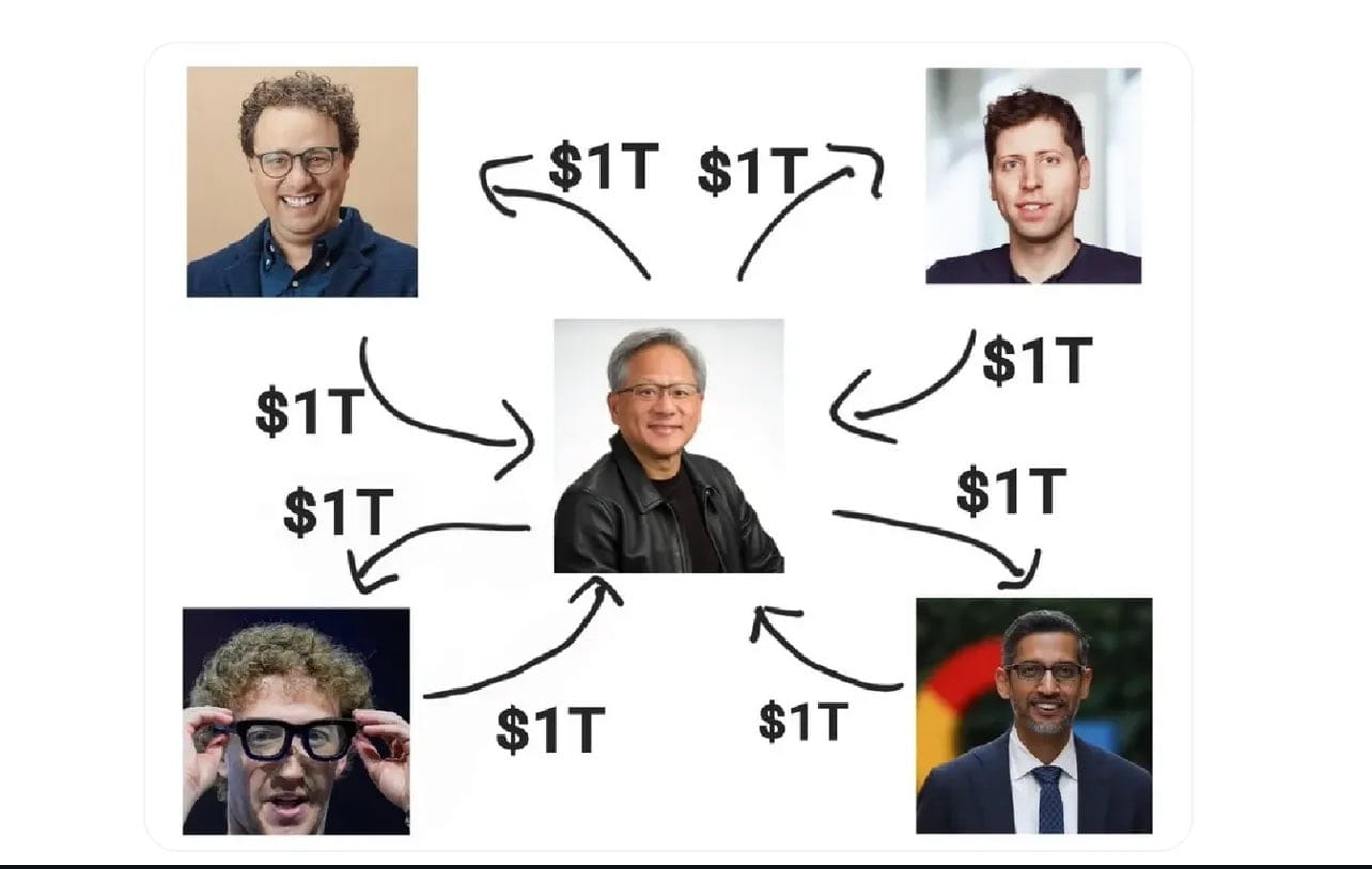 1 ⃣ Nvidia investit dans OpenAI → OpenAI signe un contrat avec Oracle → Oracle achète des puces Nvidia → la valorisation grimpe à plus de 1 trillion de dollars.