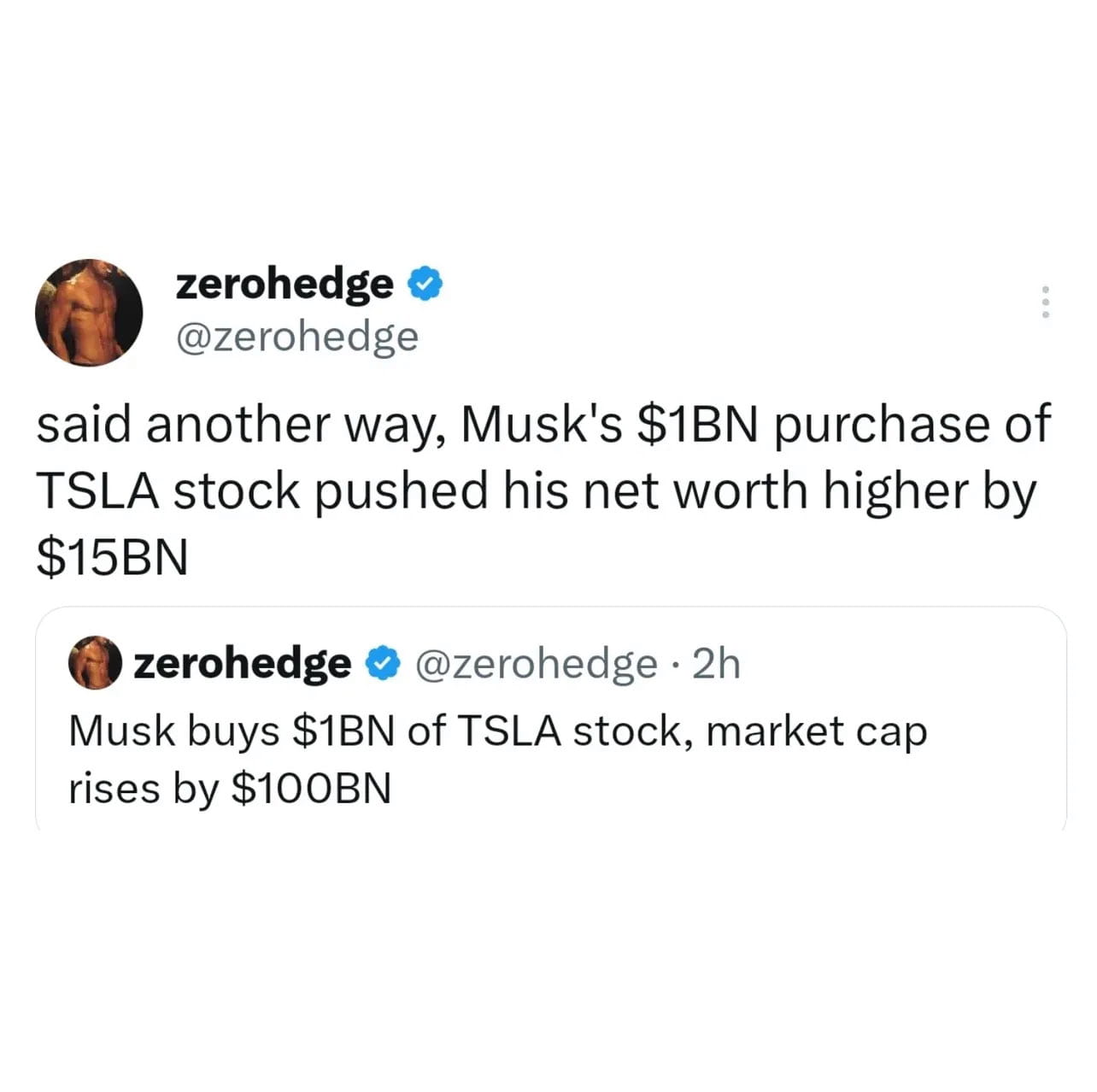 2 ⃣ Elon a acheté des actions Tesla d'une valeur de 1 milliard de dollars → la capitalisation boursière a augmenté de 100 milliards de dollars.