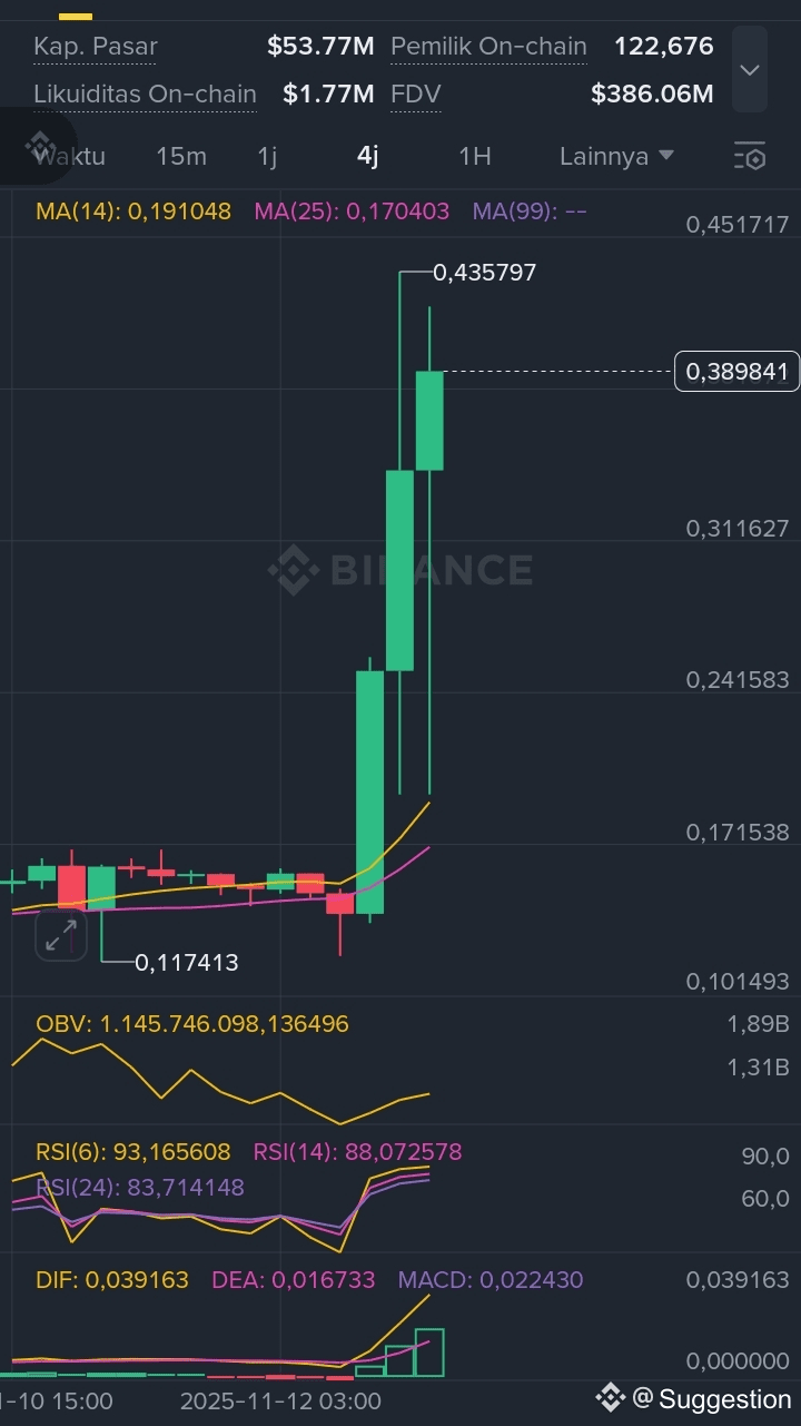 - Rentang Harga: Low historis $0.1015 (awal November), high $0.4517 (hari ini). Tren keseluruhan bullish, tapi overbought (RSI >80).