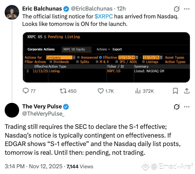 وكتب كبير محللي صناديق المؤشرات في بلومبرغ، إريك بالتشوناس، على منصة X: “إشعار الإدراج الرسمي لـ XRPC وصل من ناسداك”، مضيفًا: “يبدو أن الإطلاق غدًا قيد التنفيذ.”
