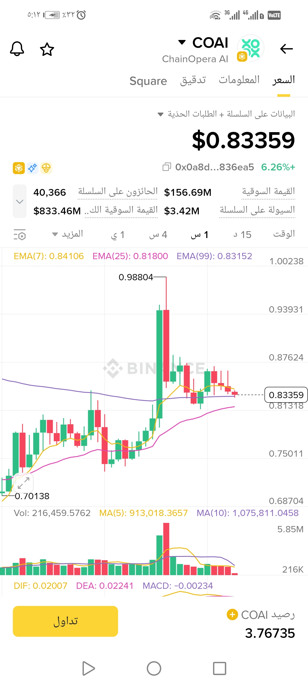 La monnaie COAI se négocie actuellement à 0,83359 $ après une phase de correction baissière depuis le sommet de 0,98804. Le mouvement est maintenant dans une plage de consolidation étroite qui reflète un équilibre de force entre les acheteurs et les vendeurs, mais avec une tendance claire à la domination des vendeurs à court terme.