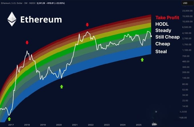 Le graphique s'étendant de 2017 à 2027 raconte une histoire convaincante. Chaque grand rallye d'Ethereum a originé de ces zones inférieures exactes. La course de 2017 qui a fait passer l'ETH de deux chiffres à 1 400 $. L'explosion DeFi de l'été 2020-2021 qui a dépassé les 4 800 $. Les deux ont commencé lorsque l'arc-en-ciel montrait du bleu et du vert, pas du rouge et de l'orange.