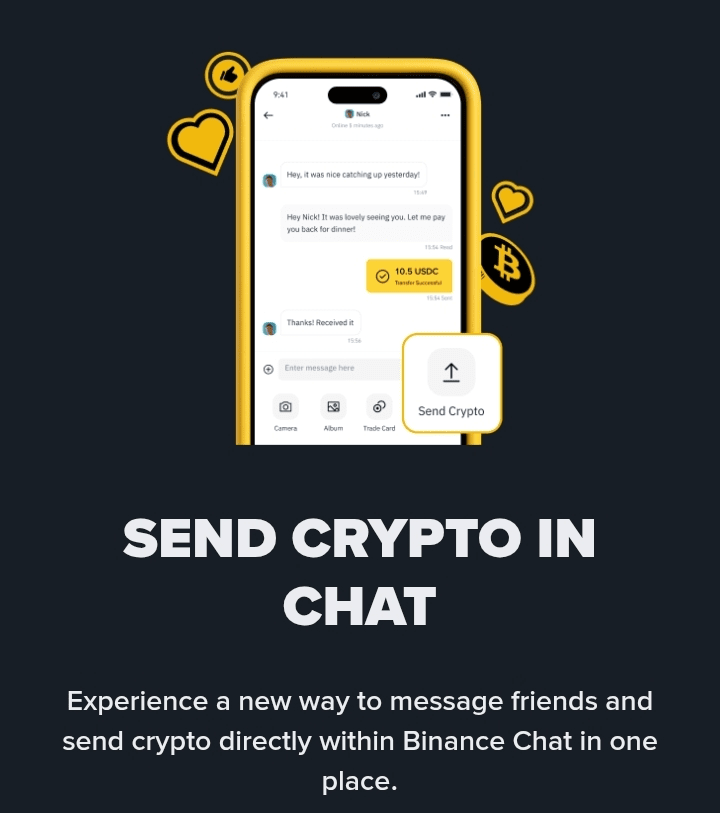 Binance a introduit une nouvelle fonctionnalité qui vous permet d'envoyer des crypto-monnaies directement dans vos conversations de chat — pas besoin de changer d'onglet, pas besoin de copier des adresses de portefeuille, pas de stress.