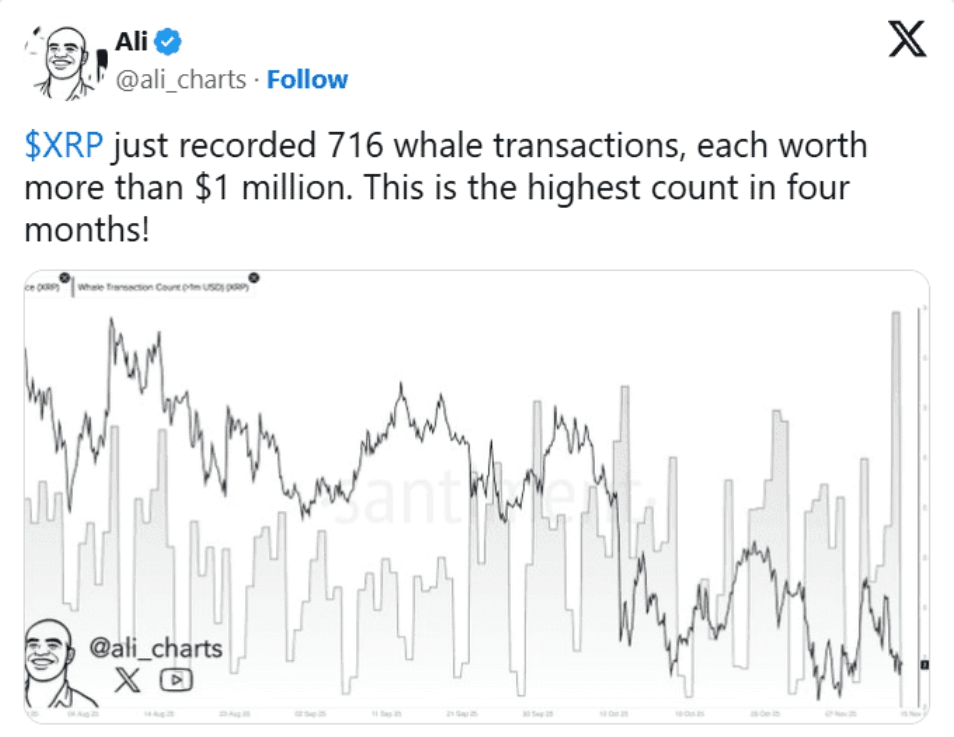 $XRP l'activité on-chain vient d'exploser 🔥 — 716 transactions de plus de 1M $ chacune, le plus élevé en 4 mois ! Les grands portefeuilles se positionnent clairement pour de gros mouvements, selon l'analyste Ali Martinez.