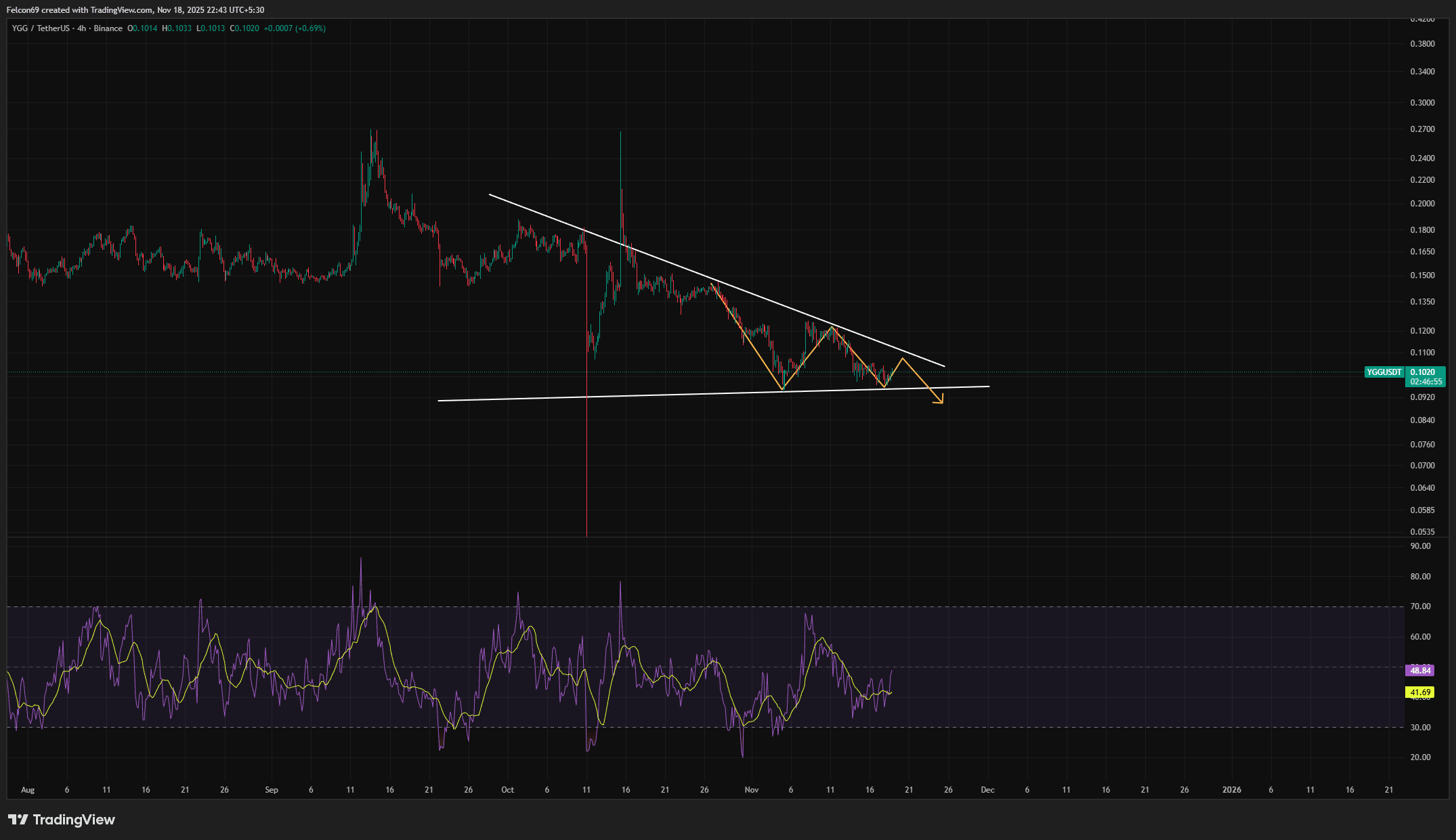 Je peux voir un motif de triangle descendant. Ce motif est marqué par des sommets plus bas et un niveau de support horizontal solide près de $0.095. Un triangle descendant est classiquement un motif de continuation baissière ⬇️. La pression de vente continue de la ligne de résistance descendante suggère que le support est vulnérable. La configuration technique actuelle suggère que les ours 🐻 ont l'avantage et essaient de forcer une chute en dessous de ce support critique de $0.095.