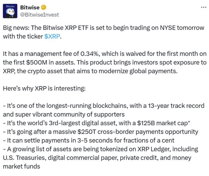 Bitwise Asset Management lance officiellement son nouveau ETF au comptant $XRP aujourd'hui jeudi, coté à la Bourse de New York sous le symbole audacieux et controversé “XRP.”