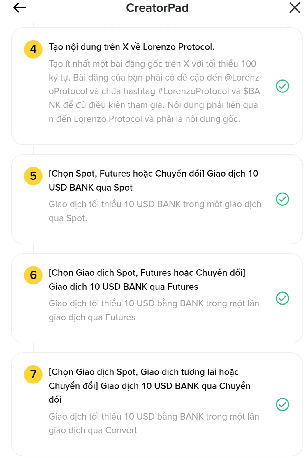 Terminez 7 missions pour débloquer la récompense de jetons #BANK d'une valeur de 1.890.000. 100 meilleurs créateurs du classement du projet de 30 jours du Lorenzo Protocol* partageront 70% de la valeur totale des récompenses et tous les autres participants qualifiés partageront 20%. 50 meilleurs créateurs du classement des créateurs de Square 7 jours à partir de la date de lancement de la campagne partageront 10% de la valeur totale des récompenses. *Pour être éligible au classement du projet Lorenzo Protocol, vous devez compléter la Mission 1 et 3 ainsi que la Mission 5, 6 ou 7. Pour être éligible à la récompense, vous devez accomplir des missions supplémentaires de suivi X et de publication (Missions 2 et 4). Remarque : Les Missions 2 et 4 n'affectent pas votre classement. Les publications liées au Red Packet ou aux cadeaux ne seront pas éligibles. Les participants ayant un comportement suspect concernant les vues, les interactions ou suspectés d'utiliser des bots automatisés seront exclus de l'événement. Toute modification des publications précédemment publiées ayant un haut niveau d'interaction pour être réutilisées comme contenu de projet entraînera une exclusion. Les récompenses seront distribuées le 09/01/2026 dans le Centre de récompenses.