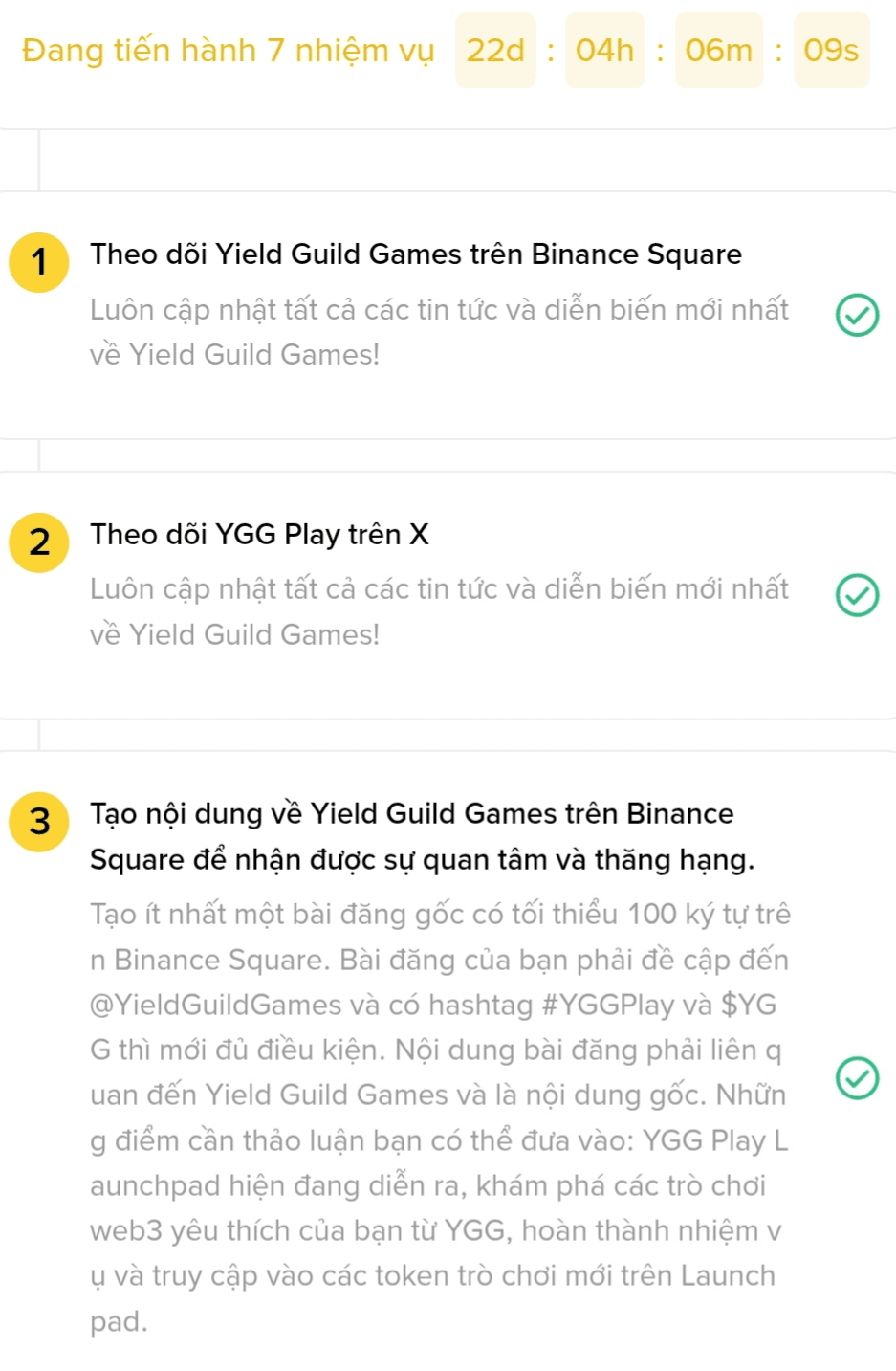 Complétez toutes les missions pour recevoir une part du fonds de récompense d'une valeur de 833.333 jetons YGG. Le fonds de récompense sera réparti à 70 % pour les 100 meilleurs créateurs du classement des projets de 30 jours de Yield Guild Games et à 30 % pour tous les participants éligibles. *Pour être éligible à participer au classement des projets de Yield Guild Games, vous devez compléter les missions 1 et 3 ainsi que la mission 5, 6 ou 7. Pour être éligible à recevoir une part du fonds de récompense, vous devez également compléter les missions de suivi et de publication sur X (missions 2 et 4). Remarque : Les missions 2 et 4 n'affectent pas votre classement. Les publications concernant les enveloppes rouges ou les cadeaux seront considérées comme non valides. Les participants détectés avec des vues, des interactions suspectes ou soupçonnés d'utiliser des bots automatisés seront exclus de l'événement. Tout acte de modification d'un post déjà publié avec un niveau d'interaction élevé dans le but d'être réutilisé comme participation sera disqualifié. Les récompenses seront attribuées au plus tard le 31/12/2025 dans la Station de récompense.