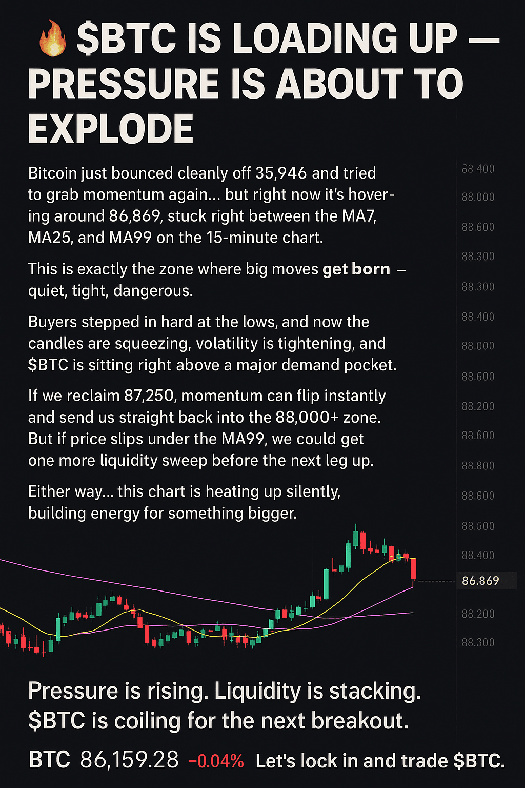 Bitcoin vient de rebondir proprement à 85,946 et a essayé de reprendre de l'élan à nouveau… mais en ce moment, il tourne autour de 86,869, coincé entre le MA7, le MA25 et le MA99 sur le graphique de 15 minutes.