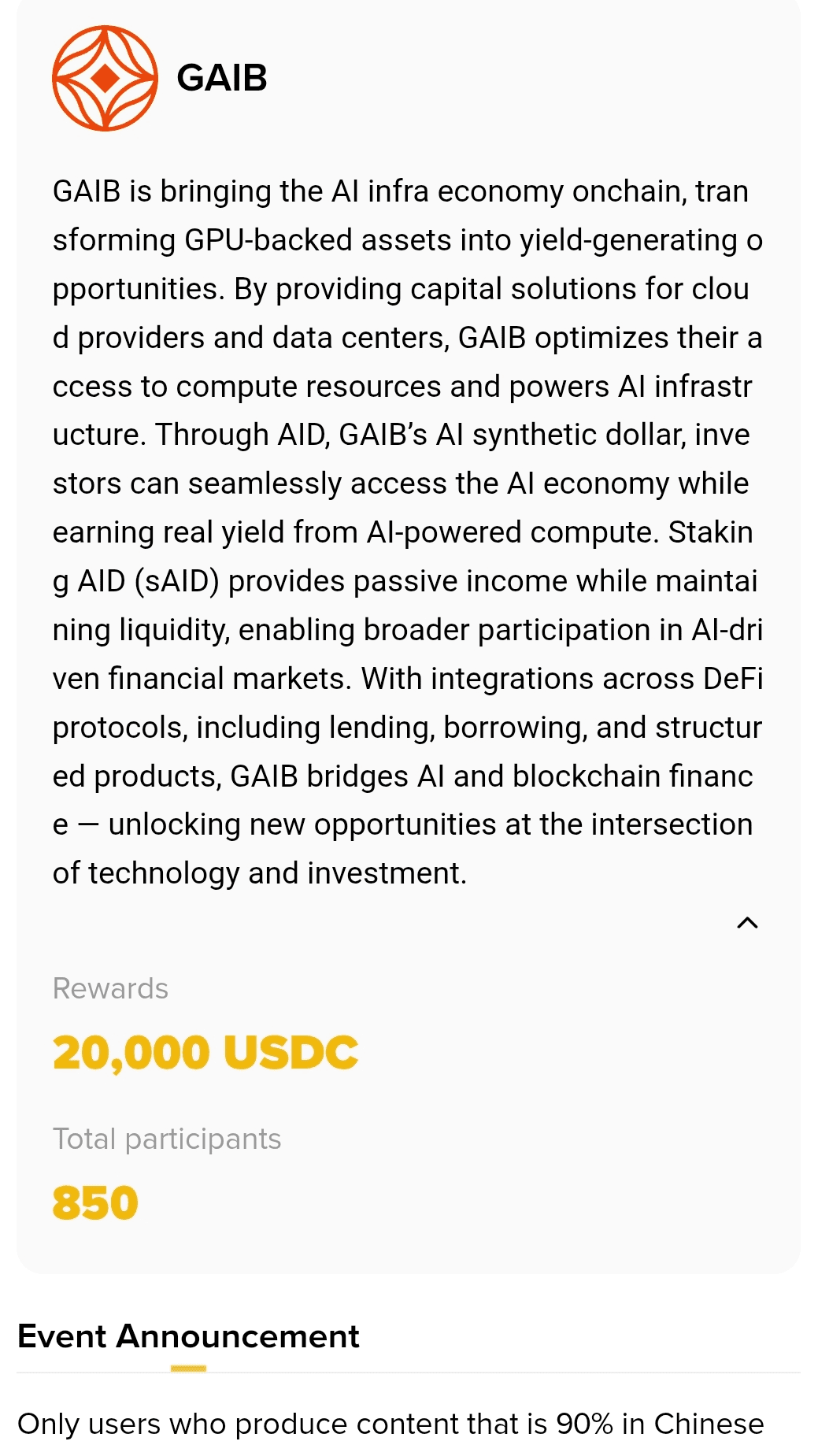 GAIB est en train d'introduire l'économie des infrastructures d'intelligence artificielle sur la chaîne, en transformant les actifs soutenus par GPU en opportunités d'investissement générant des revenus. GAIB optimise les moyens d'accès des fournisseurs de services cloud et des centres de données aux ressources informatiques en leur offrant des solutions de financement, tout en alimentant les infrastructures d'intelligence artificielle. Grâce à l'AID, le dollar synthétique d'IA de GAIB, les investisseurs peuvent accéder sans heurt à l'économie de l'intelligence artificielle tout en tirant des revenus concrets provenant du calcul piloté par l'IA. Le staking de l'AID (SAID) permet de générer des revenus passifs tout en maintenant la liquidité, favorisant ainsi une participation plus large aux marchés financiers pilotés par l'IA. GAIB s'intègre aux protocoles DeFi (y compris les prêts et produits structurés), reliant l'intelligence artificielle et la finance blockchain, pour libérer de nouvelles opportunités à la croisée de la technologie et de l'investissement.