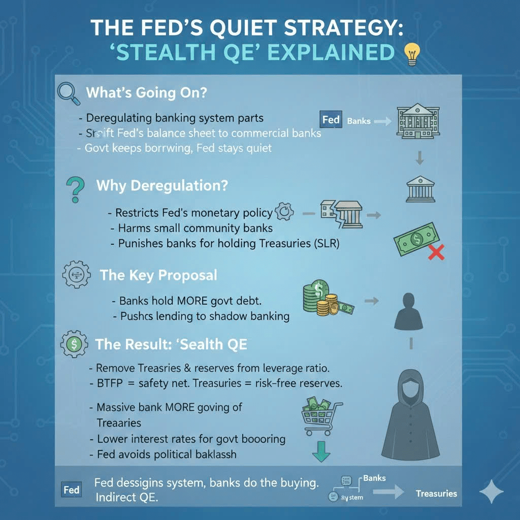 Au lieu d'imprimer directement de l'argent, la Fed réforme le système pour que les banques le fassent à sa place — une forme plus discrète et indirecte de QE.