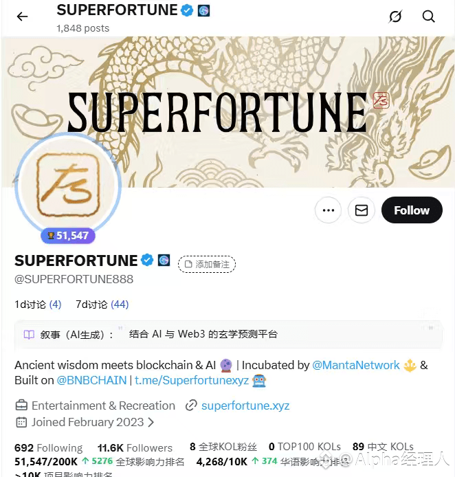 $GUA 是 SUPERFORTUNE 的原生代币,用于解锁详细运势报告、购买幸运符、应用内支付等功能。属于典型玄学 + 应用场景结合的轻应用项目。