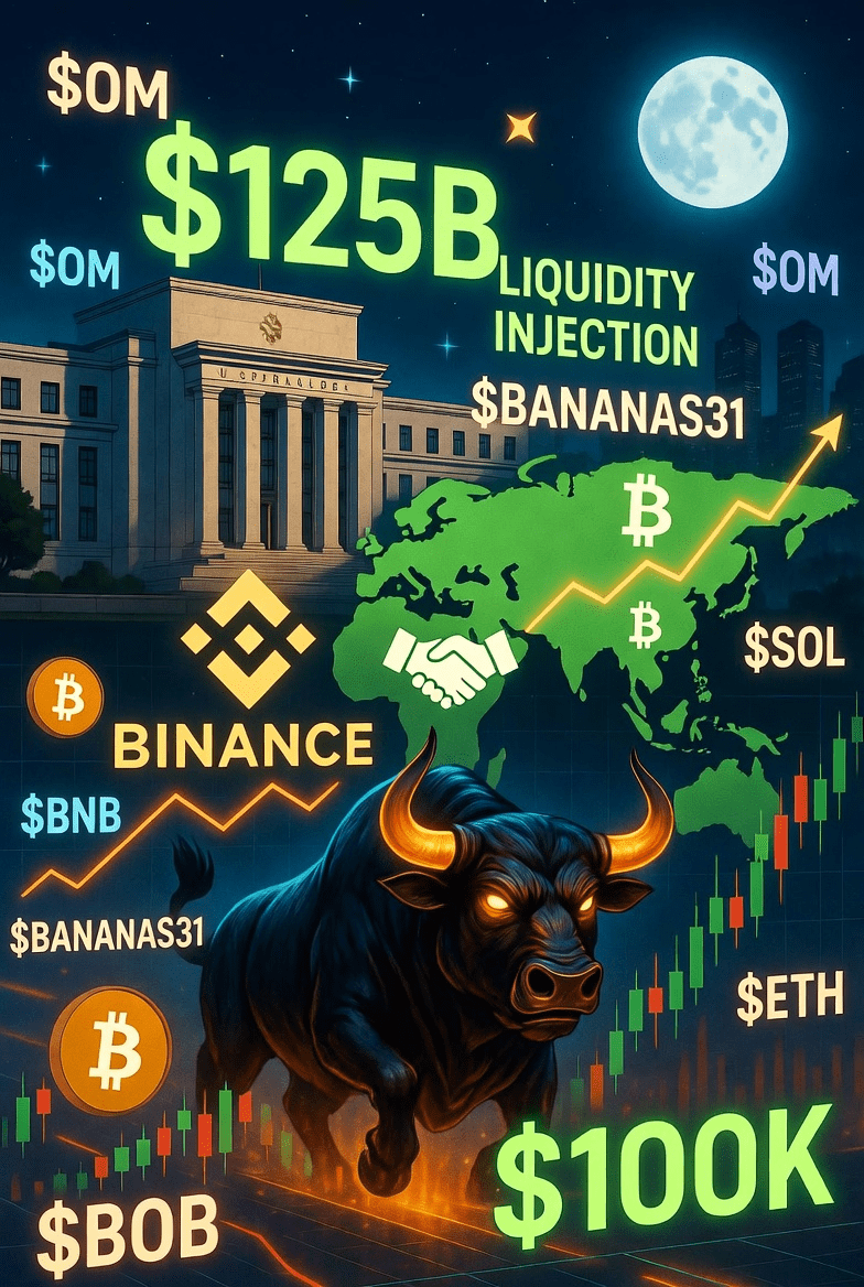 27 novembre 2025 – Les marchés de la crypto s'affolent alors que la dernière injection de liquidités de 125 MILLIARDS $ de la Réserve fédérale des États-Unis via des opérations de repo arrive, culminant un mois d'assouplissement totalisant plus de 175 milliards $ depuis octobre – faisant écho à la flambée de 2021 qui a propulsé le BTC à 69K.80bbfe Pendant ce temps, l'attaque agressive de Binance en Asie – y compris de nouveaux partenariats et des rumeurs de contrats multi-milliards – signale une explosion du volume de trading. Les baissiers ? Éteints. Les baisses ? Entrées. La mèche est allumée pour un BTC à plus de 100K $ d'ici la fin de l'année. 🌙