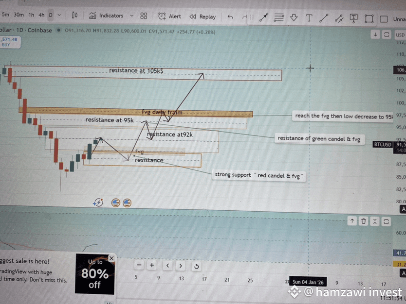 As my own analysis i see that btc going to 87k $BTC after a #ResistanceLevels at 92k making a "W" (up double boutom ) then to 95.5k when he will have a resistance fom the hammer green candel to reach again #92k (retest) from this price btc will go to #97k when he will have #FVGZone and decrease to #95k getting a support (old #resistance ) and moving to #105k before #2026