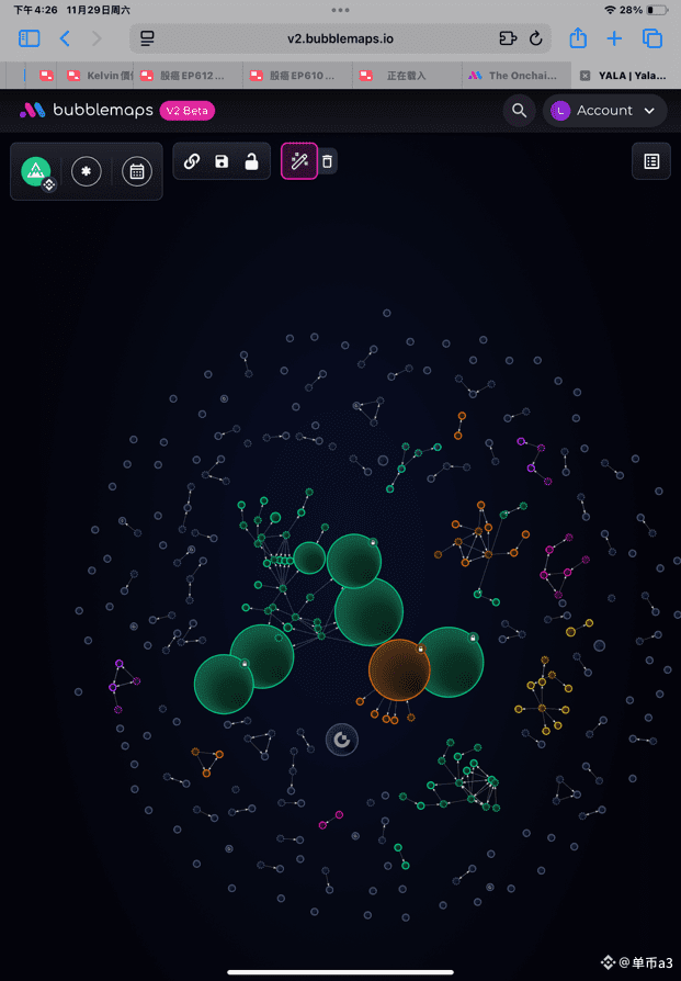 • 连接线意味着这些钱包之间有频繁的资金往来,通常属于同一个实体(项目方、早期投资人或主力庄家)。