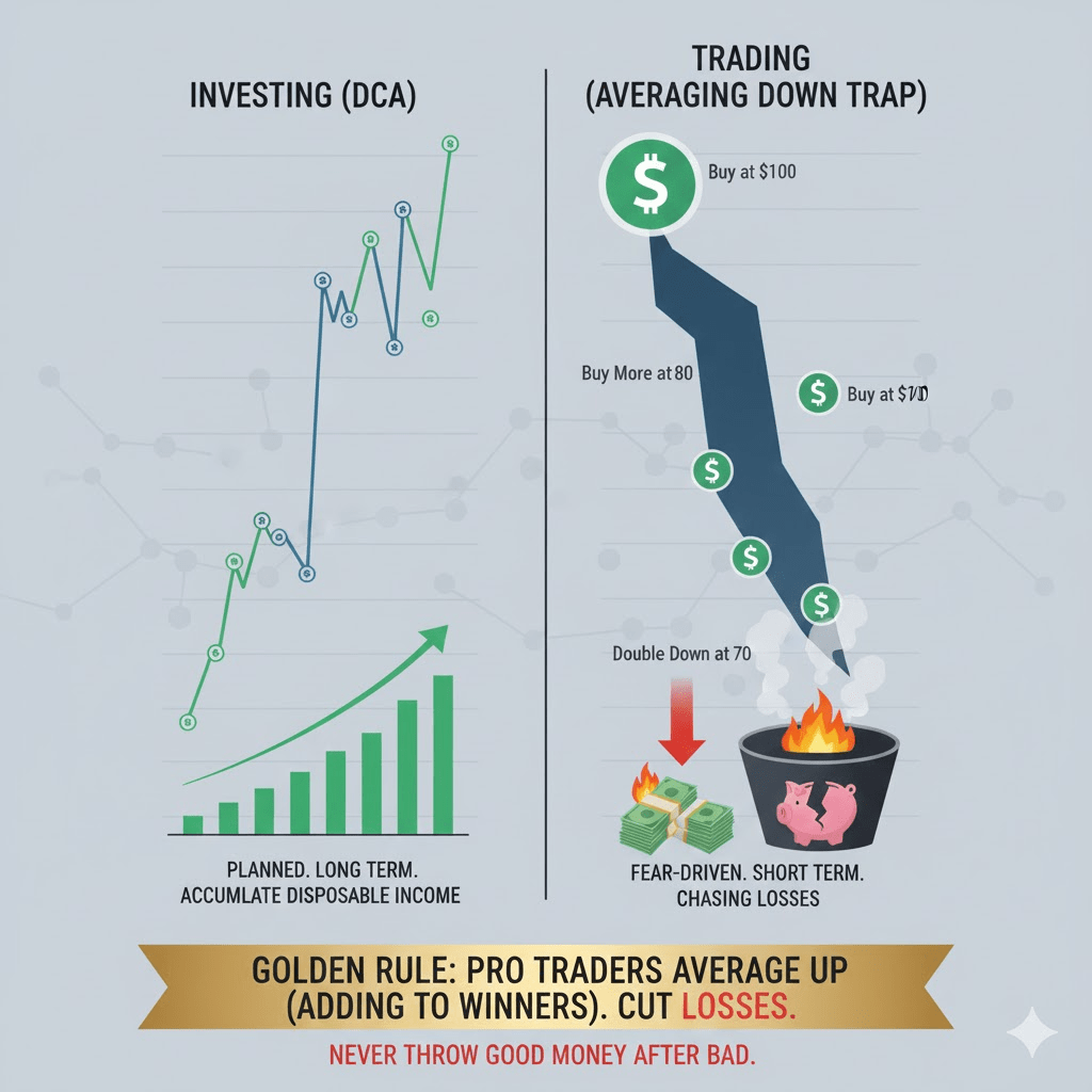 Pourquoi cette distinction est-elle importante ? Parce que le DCA est une stratégie d'investissement, tandis que la moyennisation vers le bas est souvent une rationalisation du trader.