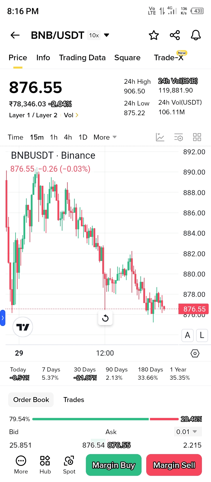 La capture d'écran montre la paire de trading BNB/USDT sur Binance avec le prix à 876,55 $, légèrement en baisse de 0,03 %. Le graphique de 15 minutes affiche une tendance à la baisse claire, les bougies montrant des sommets et des creux plus bas tout au long de la session.