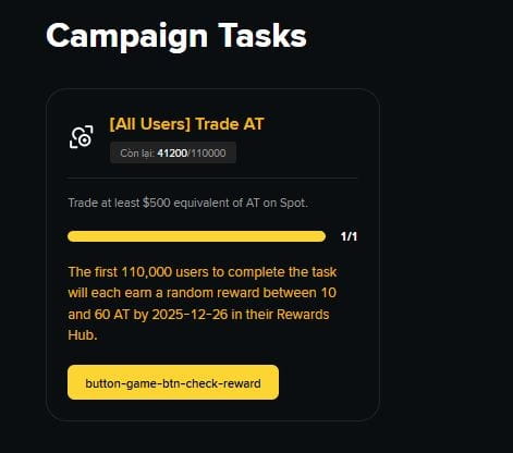 Actuellement, la récompense de trading $AT vient de dépasser 41k slots. Avec seulement 500U pour l'achat et la vente, vous pouvez recevoir 10-60 AT (1.7U-10U).