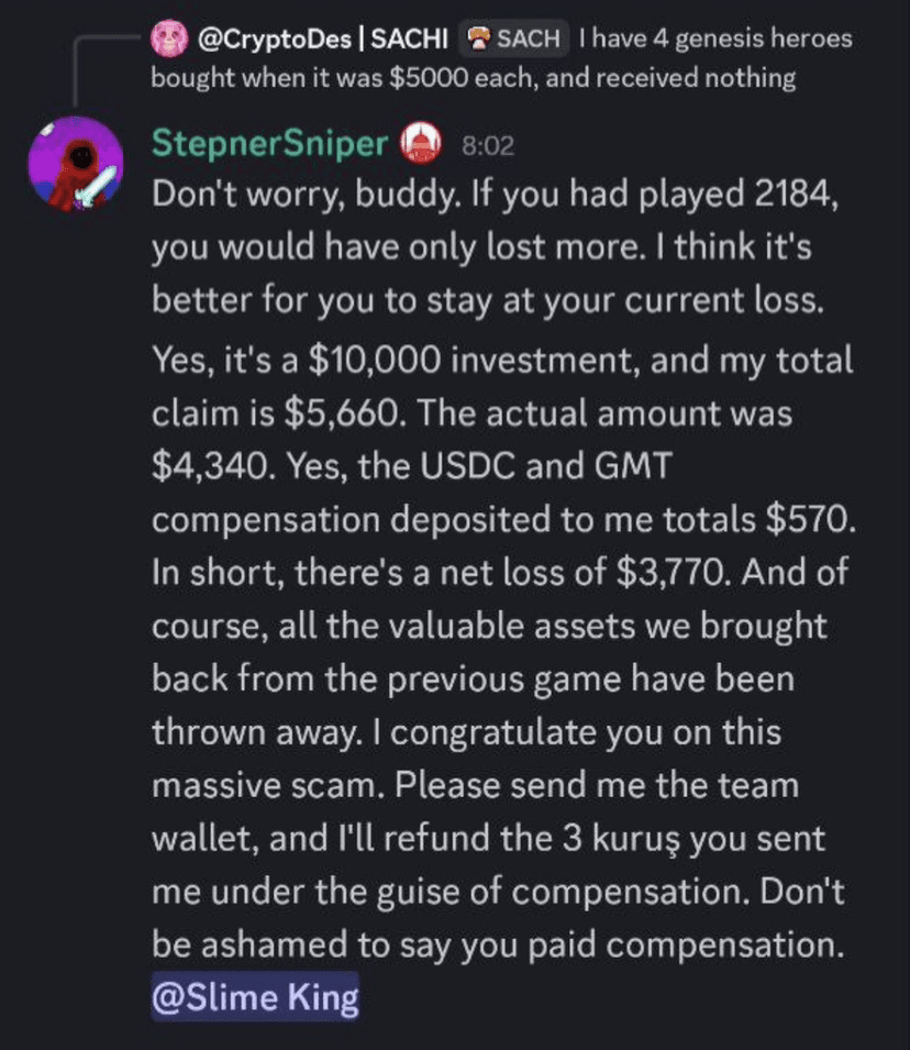 Bonjour mes chers amis anciens, le move to earn commence à entrer dans nos vies et cela a suscité un grand bruit et des échos dans le monde, étant l'un des jalons du Move to Earn.#Stepn Avec une décision soudaine, la semaine dernière, Gas Heron, qui fait partie de leur structure, a annoncé qu'il fermerait #2184 et avait déclaré qu'il couvrirait une grande partie des pertes qui en découleraient à ses utilisateurs. Aujourd'hui, avec les paiements qu'ils ont effectués, ils ont laissé tous les utilisateurs bouche bée. Un utilisateur qui a investi 30 000 $ a même exprimé sa colère en disant qu'ils avaient payé 567 $ de compensation. Le joueur a également mentionné qu'il pouvait vous renvoyer cet argent en disant qu'il exprimait son mécontentement, mais jusqu'à présent, aucune déclaration n'a été faite par l'équipe de Fsl. Beaucoup de joueurs sont réellement dans une situation très difficile, car l'argent perdu est peut-être proche de 1 million $. En ce moment, des paiements très dérisoires ont été effectués à tout le monde, ce qui a vraiment dérangé les joueurs. La vraie question est que le fait qu'une équipe aussi établie que Fsl paie des compensations de cette manière défie la logique. Je n'ai aucune idée de comment cela se terminera, mais une chose est certaine, il est vraiment si facile de perdre l'argent des gens en une nuit. Ne vous laissez pas berner par de belles paroles, c'est fini, il n'y a aucun endroit où vous pouvez poser des questions ou revendiquer vos droits. Maintenant, si cela devait aller en justice, les utilisateurs ne sauraient à qui s'adresser, qui est responsable. C'est le pire aspect de la crypto, tout peut s'effondrer en un instant. Que Dieu aide ceux qui sont en difficulté. Nous sommes arrivés à la fin d'une époque, probablement adieu STEPN, adieu GMT.