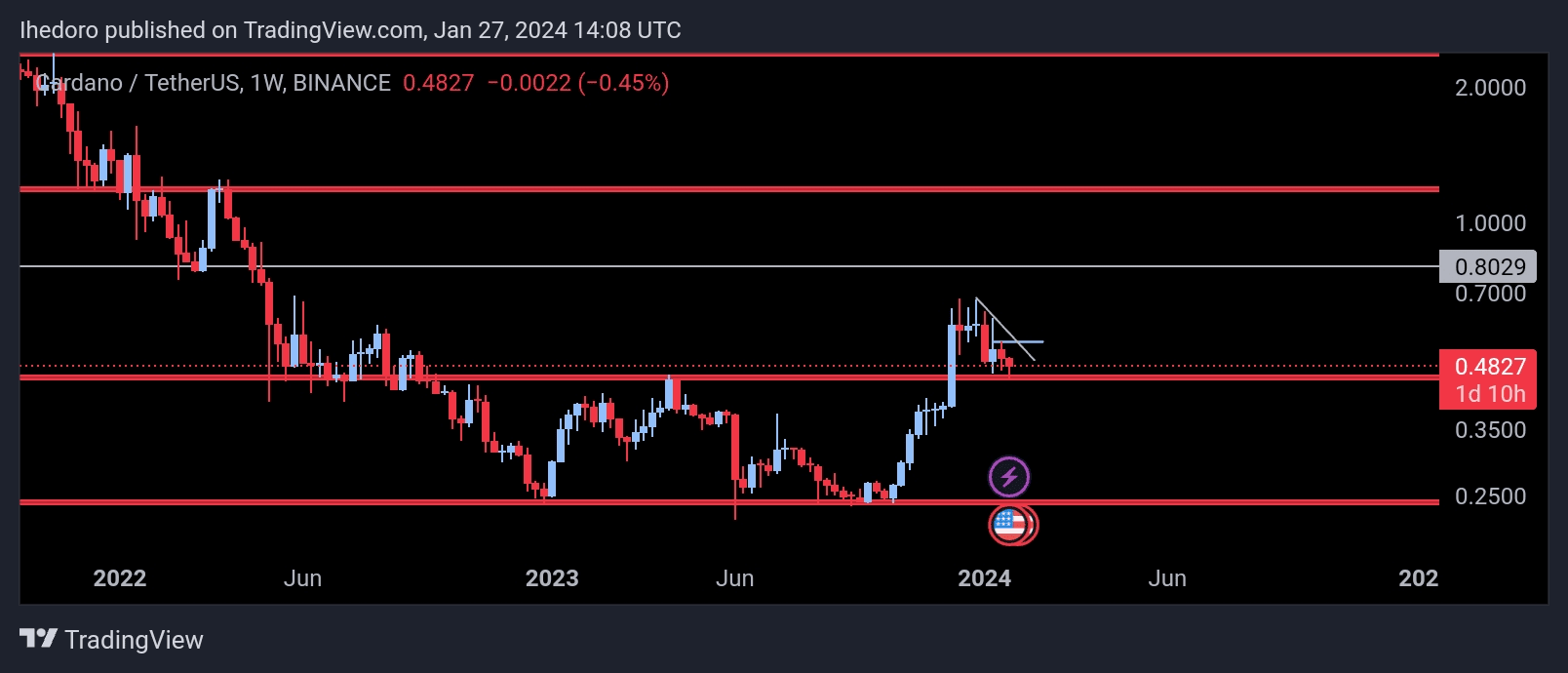 Sur la période hebdomadaire, Cardano a formé une forte tendance de retournement haussier : un double fond et un nouveau test sur le décolleté. Je ne vois aucune raison pour laquelle Cardano ne rebondirait pas à la hausse ! 🚀
