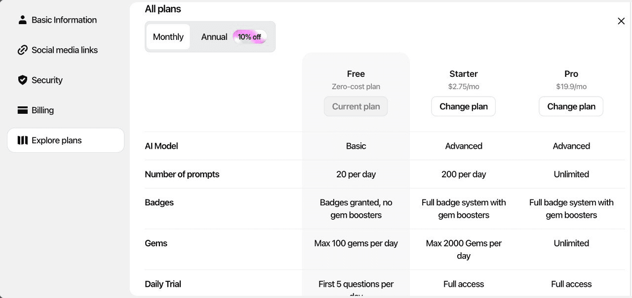 Le Starter se distingue comme le pack le plus équilibré en termes de prix et de performance. L'accès à un modèle d'intelligence artificielle avancé, une limite quotidienne de 200 questions, des données analytiques puissantes et une limite de gems élevée en font un choix idéal pour ceux qui analysent et accumulent des airdrops.