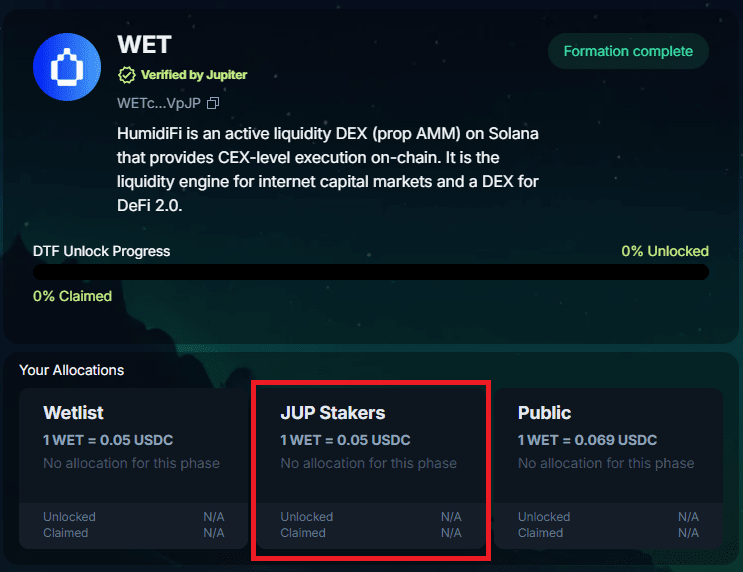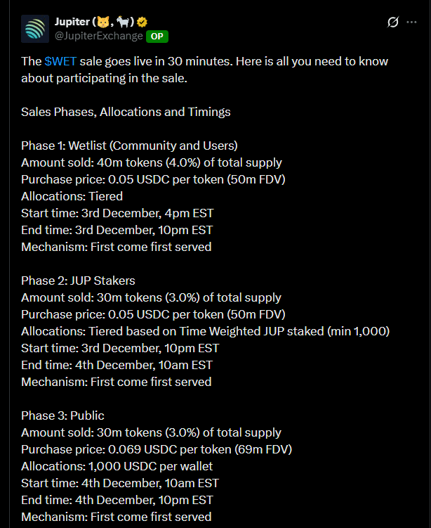 Le positif de ce premier lancement de Jupiter DTF, c'est que les stakers de Jupiter ont pu acheter à l'avance les #tokens WET en pré-vente, à un prix de 0,05 $, malgré un plafond d'investissement et la nécessité de rester attentifs avant que les tokens WET ne s'épuisent (il y avait un montant maximum attribué aux stakers de Jupiter). Même Jupiter a écouté la communauté et a décidé d'augmenter le montant des tokens WET disponibles.