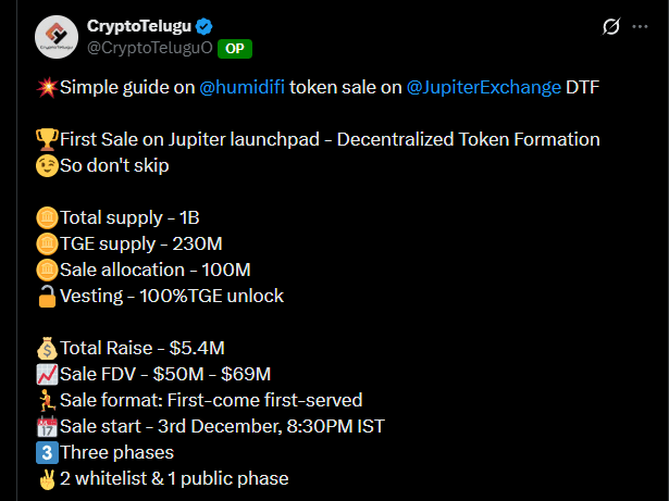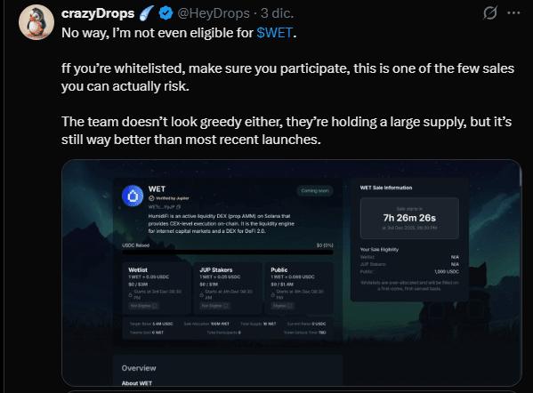 Aujourd'hui, 4 décembre, la pré-vente officielle du #Token WET du protocole HumidiFi sur le réseau de @Solana Official s'est terminée avec succès. Elle a été réalisée via le launchpad de @Jupiter 🪐 appelé JupiterDTF, mais elle laisse quelques enseignements pour les prochains lancements. Que s'est-il passé ? Explorons.