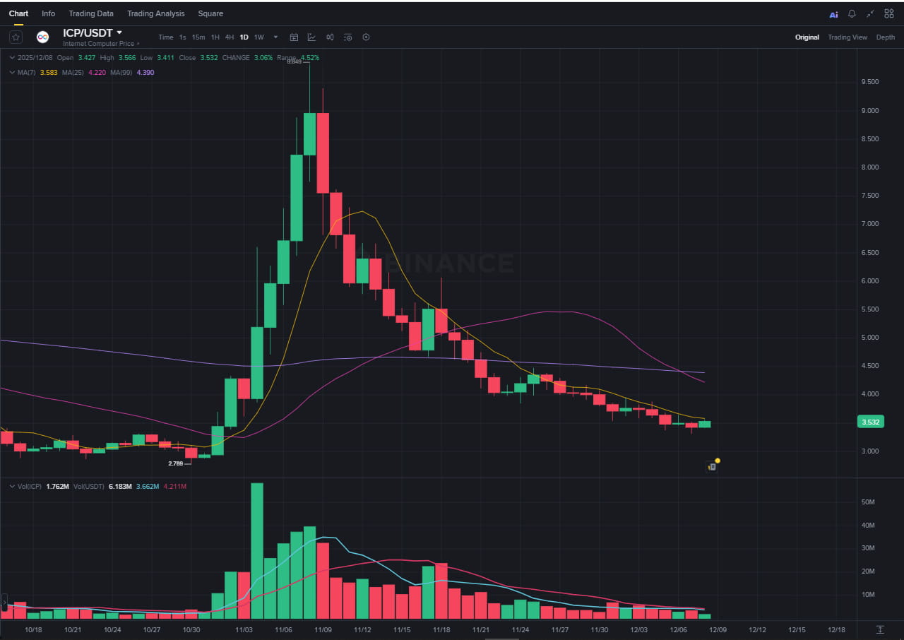 L'ICP a atteint un pic autour de 9,50 $ début novembre, mais une forte vague de pression vendeuse a rapidement fait chuter le prix. La correction a été brutale, reflétant :