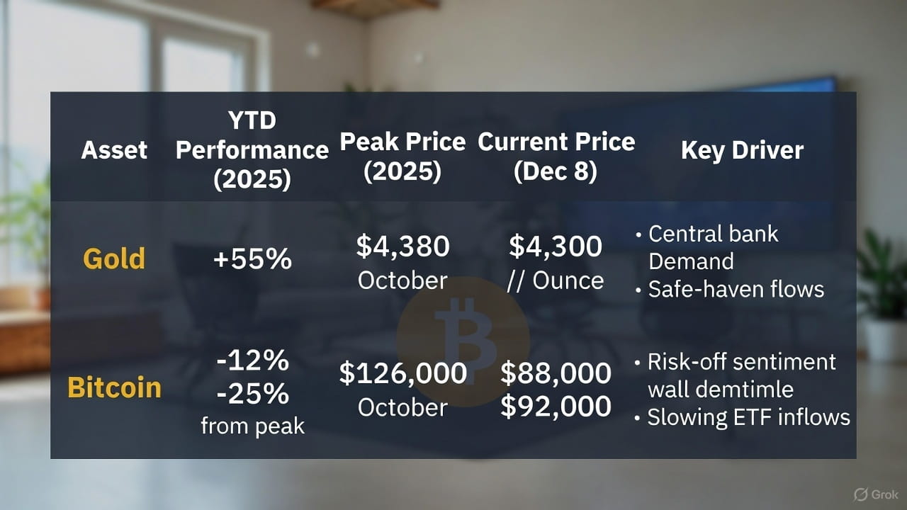 Le débat séculaire entre Bitcoin (BTC) en tant que "or numérique" et l'or traditionnel continue de s'intensifier en 2025, l'or surperformant de manière décisive dans un contexte de volatilité économique, d'achats par les banques centrales et de tensions géopolitiques. Bitcoin, après avoir atteint son pic à 126000 $ en octobre, est tombé en dessous de 90000 $, en baisse de plus de 25 % par rapport à son sommet et affichant sa plus faible performance depuis le début de l'année par rapport à l'or jamais enregistrée. L'or, quant à lui, a bondi de 55 % depuis le début de l'année, atteignant plus de 4300 $ l'once, en faisant la classe d'actifs majeurs la mieux performante. Voici un aperçu des derniers développements, des avis d'experts et des analyses de marché.
