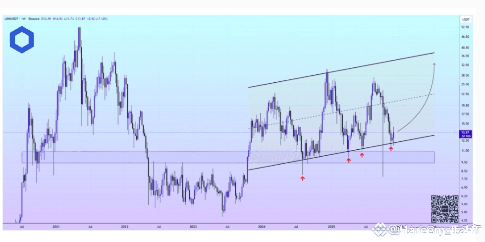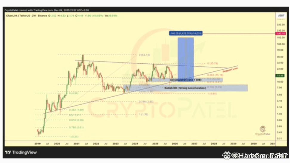 According to market analyst Crypto Patel, Chain link has been forming a long-term accumulation structure since 2020. Despite recent pullbacks, the macro trend remains intact.