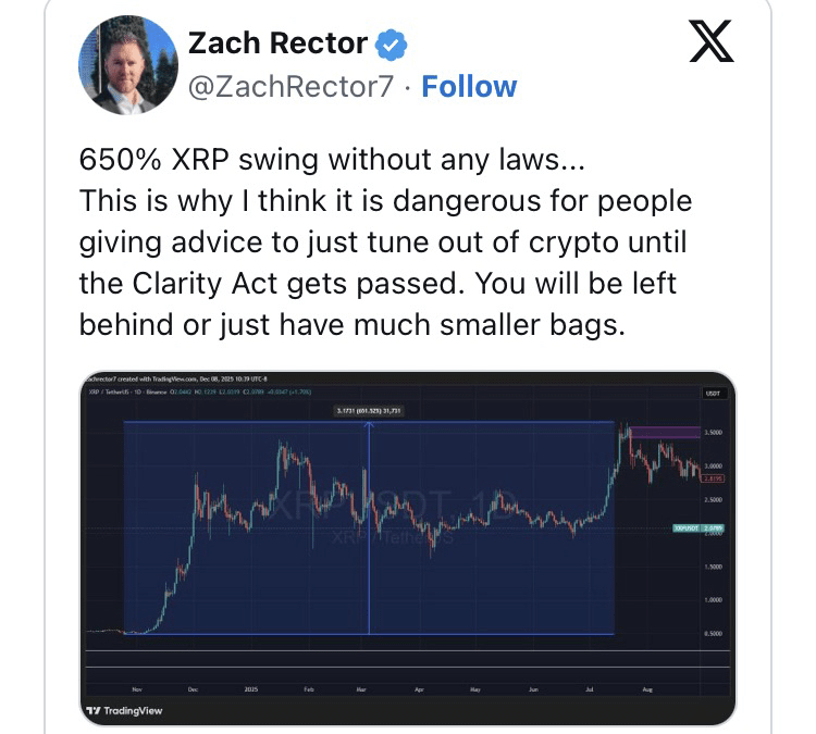 Après des mois de consolidation, XRP a de nouveau prolongé la course jusqu'au sommet de 3,66 $ en juillet 2025. Selon Rector, cela a marqué une augmentation de 650 %. Le commentateur du marché a souligné que cette course s'est produite « sans aucune loi », confirmant que XRP avait déjà démontré sa propension à la croissance à un moment où la Clarity Act n'avait pas été adoptée.