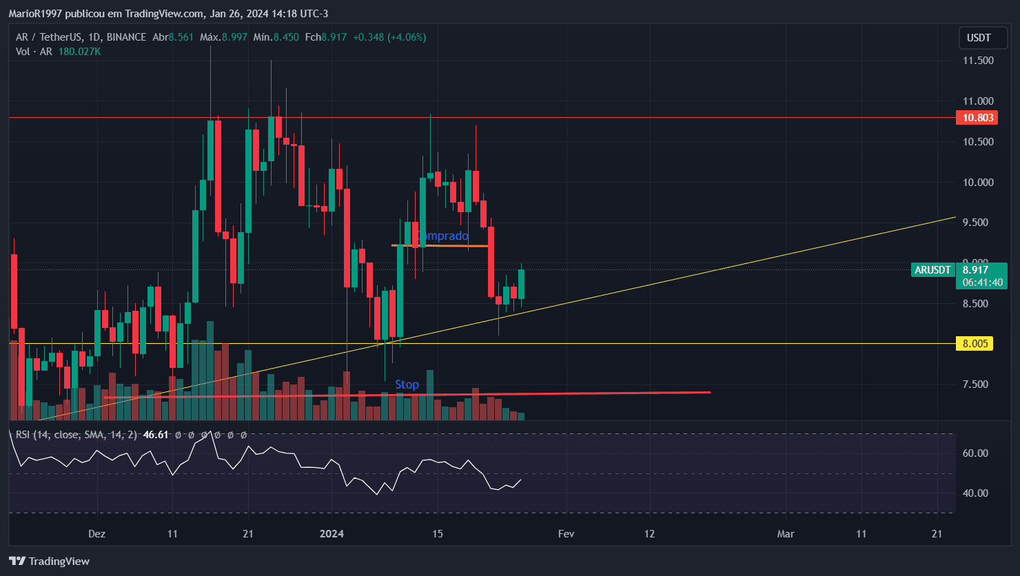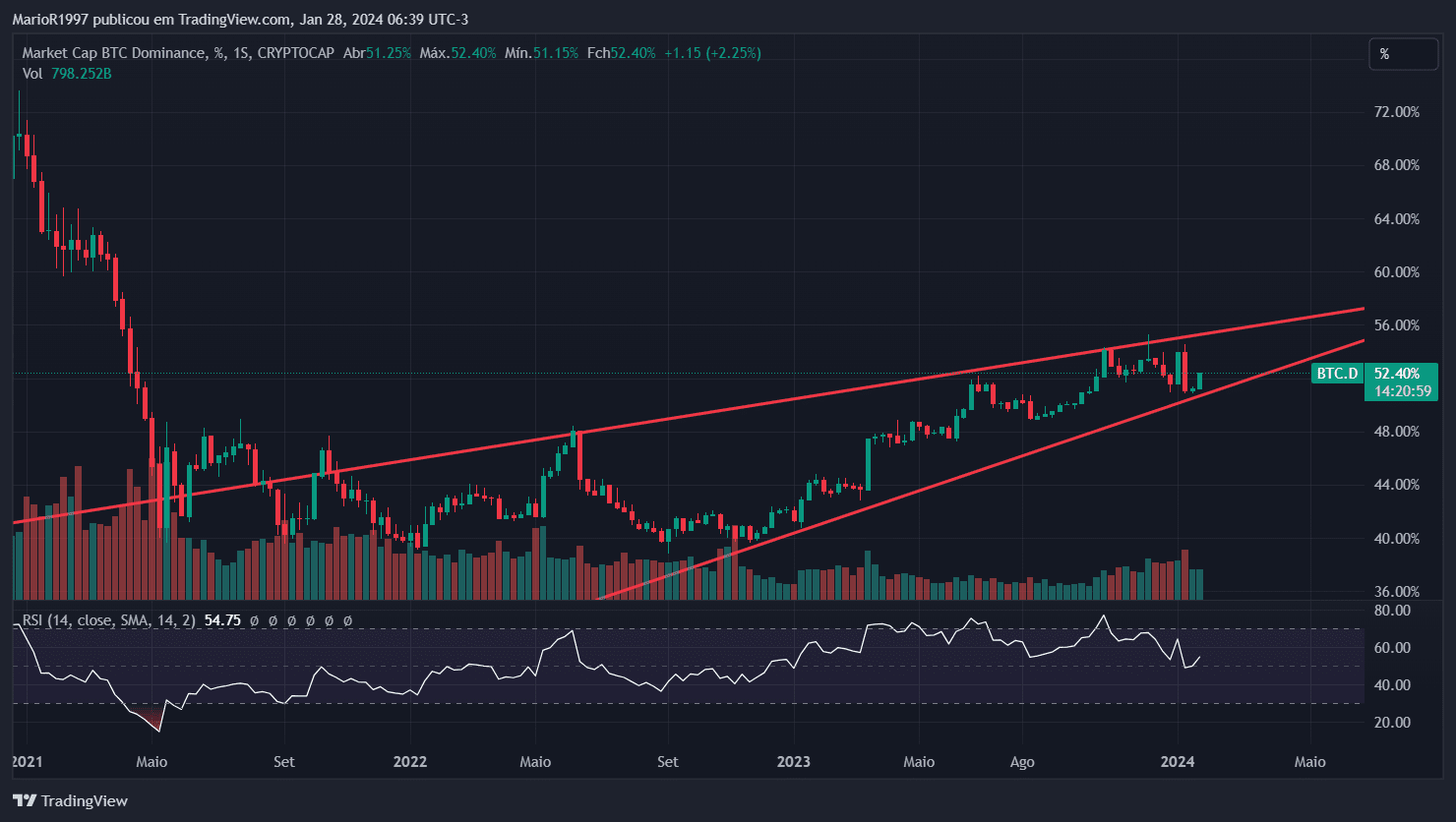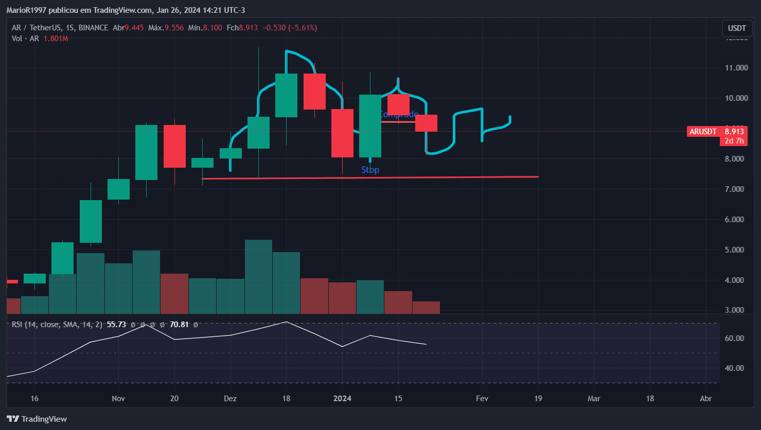 Outro aspecto crucial a destacar é nossa proximidade da Altseason, período em que as altcoins demonstram desempenho superior ao do Bitcoin. Esta tendência pode ser identificada no gráfico Semanal (1W) da Dominância de Mercado do BTC (BTC.D), onde está se formando uma cunha ascendente. Esse padrão gráfico tem uma probabilidade mais elevada de rompimento para baixo, sinalizando o possível início da Altseason. Essa dinâmica justifica a acumulação de preços na criptomoeda AR no momento.