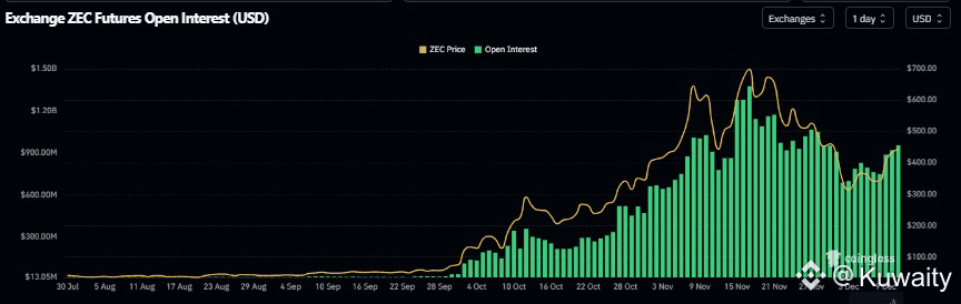 تظهر بيانات CoinGlass أن الفائدة المفتوحة لعقود ZEC الآجلة في البورصات ارتفعت من 701.11 مليون دولار في 3 ديسمبر إلى 954.87 مليون دولار يوم الأربعاء، وهو أعلى مستوى منذ 29 نوفمبر. تمثل زيادة الفائدة المفتوحة دخول أموال جديدة أو إضافية إلى السوق وشراء جديد، مما قد يغذي ارتفاع سعر ZEC الحالي.