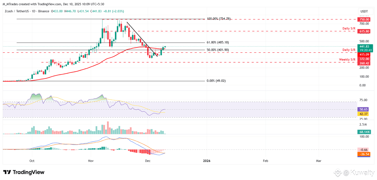 تشير التوقعات الفنية إلى أن الارتفاع قد يستمر، مع استهداف ZEC للتحرك فوق 485 دولار.