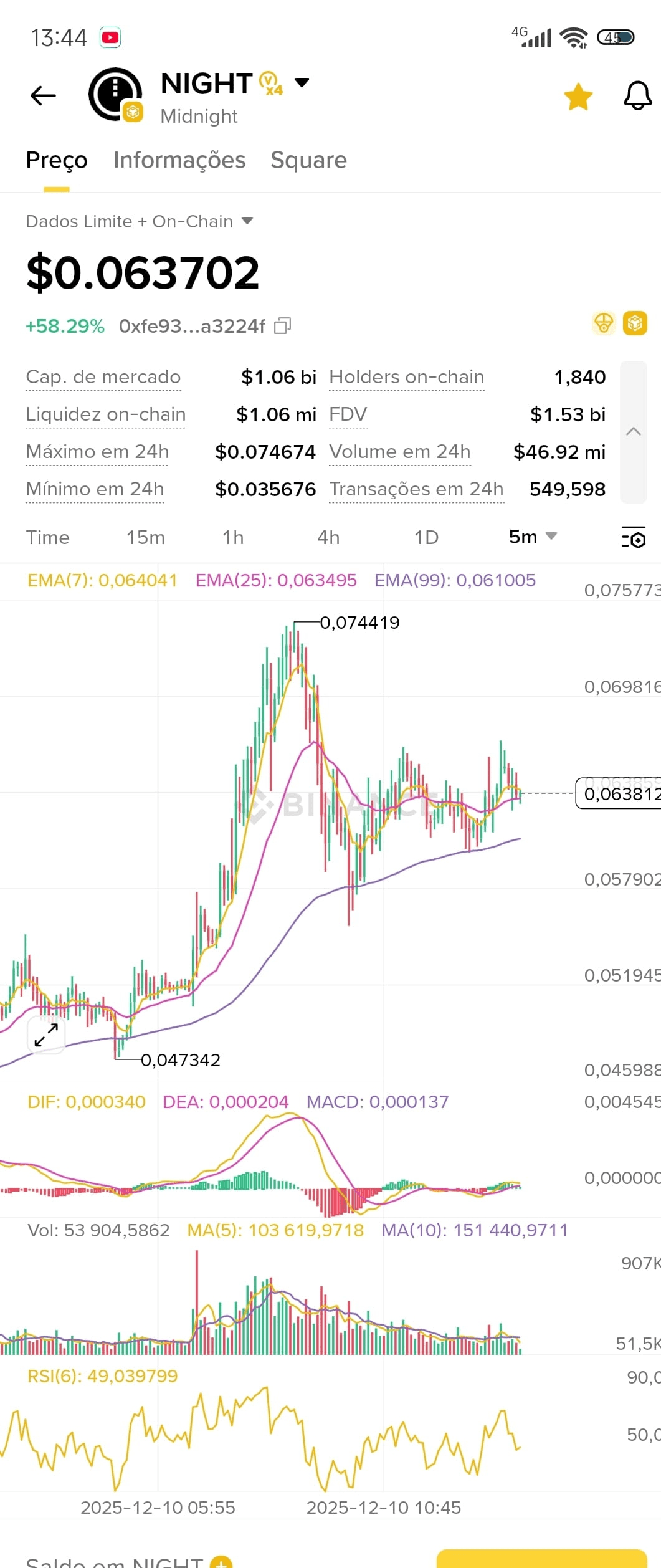 En une courte période, le NIGHT a fait un bond impressionnant, passant de la plage de 0.03000 et augmentant de plus de 58 % en seulement 24 heures, atteignant le niveau de 0.063702.