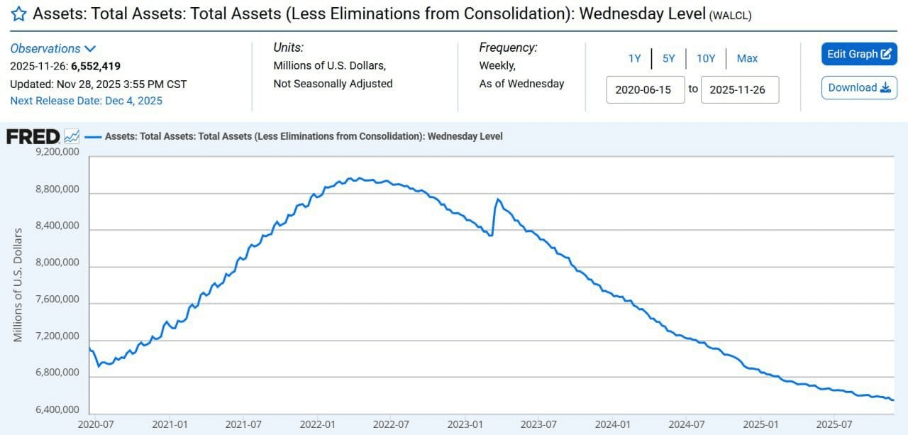 Depuis 2022, la Réserve fédérale a réduit son bilan : tous les bons du Trésor ou actifs adossés à des hypothèques arrivant à échéance ont disparu du système sans réinvestissement. Au cours de trois ans, plus de 3 trillions de dollars de liquidités ont été drainés - l'une des principales raisons qui ont conduit à la baisse des actifs à haut risque.