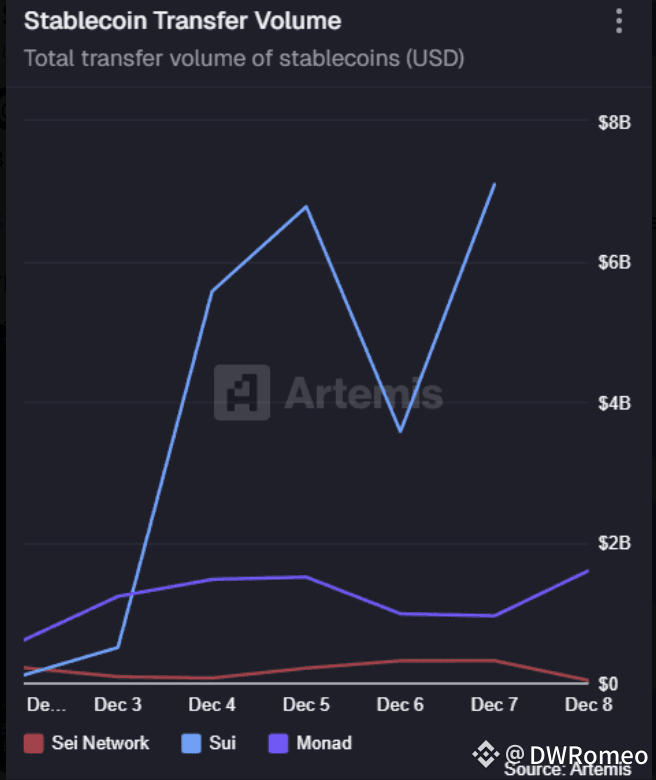 持续高量: 2025年8 月到 11 月,Sui 网络已经连续四个月处理了超过 $1800 亿美元的稳定币转账量。