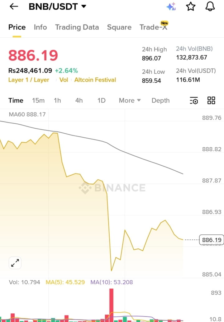 Le graphique BNB/USDT montre actuellement le prix autour de 886.19, reflétant une récupération intrajournalière de +2.64% malgré une pression de vente visible plus tôt dans la session. Le prix se négocie légèrement en dessous de la MA60 (888.17), indiquant que BNB fait encore face à une résistance à court terme de la ligne de tendance à moyen terme. La forte baisse suivie d'un rebond rapide suggère une volatilité active et une liquidité, avec des acheteurs intervenant à des niveaux inférieurs autour de la zone de support 859–865. Les pics de volume près du bas indiquent une exhaustion des vendeurs, laissant entrevoir une possible stabilisation à court terme.
