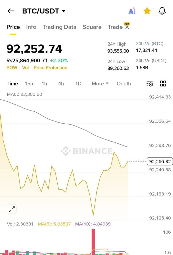Le graphique BTC/USDT montre que le Bitcoin se négocie autour de 92 252 $, en hausse de +2,30 % au cours des 24 dernières heures, avec une forte volatilité entre le bas de 89 260 $ et le haut de 93 555 $. Le prix est actuellement juste au-dessus de la MA60 (92 300), signalant un potentiel changement de momentum alors que $BTC