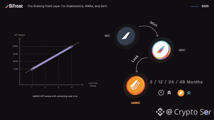 Profit redistribution flows through bbBNC, a non-transferable, ve-style token earned by locking BNC or vBNC for up to 4 years.