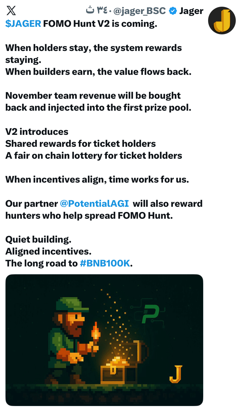 Comme l'équipe JAGER l'a toujours promis, le travail a été mené calmement et sans bruit. Aujourd'hui, ce travail n'est plus en coulisses, mais est sorti au grand jour avec l'annonce officielle de FOMO Hunt V2 — la nouvelle phase qui reflète la maturité du projet et sa vision à long terme.