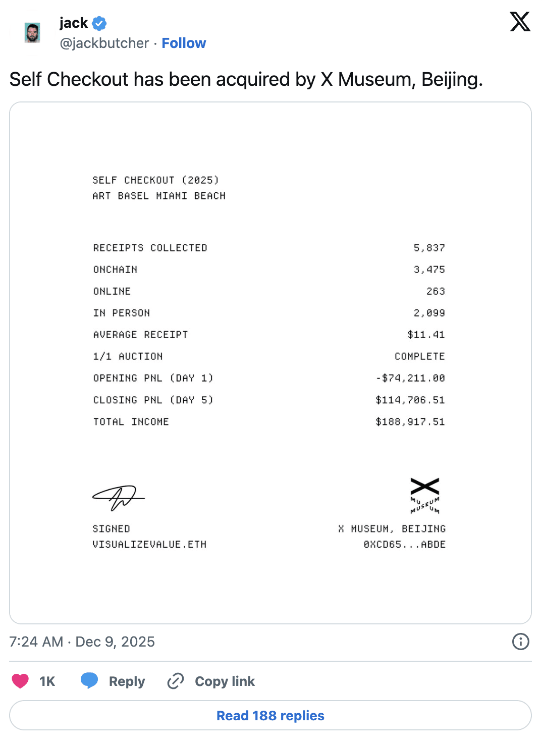 Au début de la foire, le coût de l'installation énuméré par Butcher était d'environ 74 211 dollars, et à la fin de la foire, le projet “Self Checkout” a collecté au total 5 837 reçus à travers des transactions en ligne, hors ligne et sur chaîne, avec un montant moyen de 11,41 dollars par reçu, l'enchère 1/1 s'est terminée avec un résultat net de 114 706,51 dollars et un chiffre d'affaires total de 188 917,51 dollars.