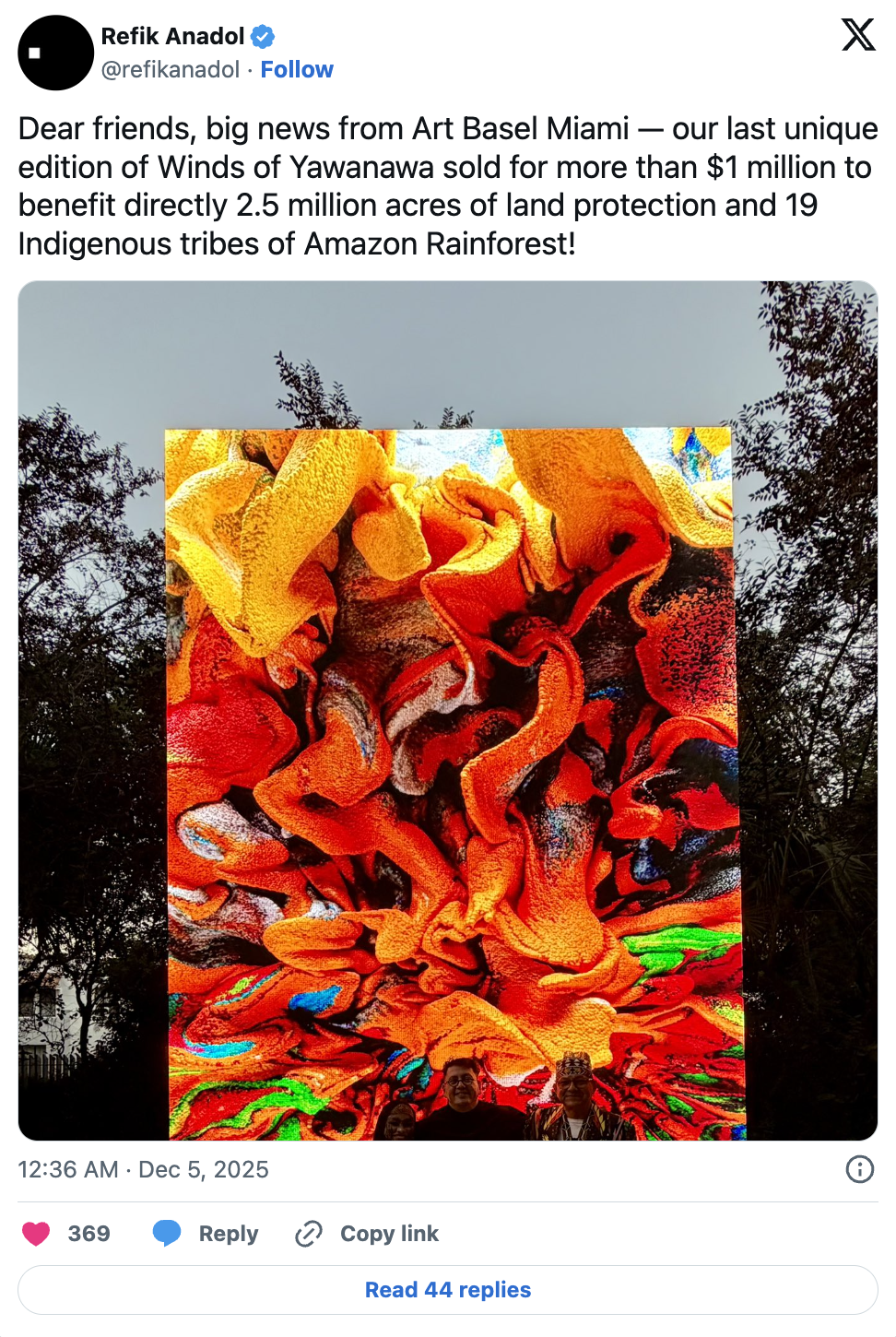 Selon un post de l'artiste sur X, la version unique finale de l'œuvre d'art numérique de Refik Anadol, “Les Vents Yawanawa”, a été vendue pour 1 million de dollars lors de la foire Art Basel à Miami.