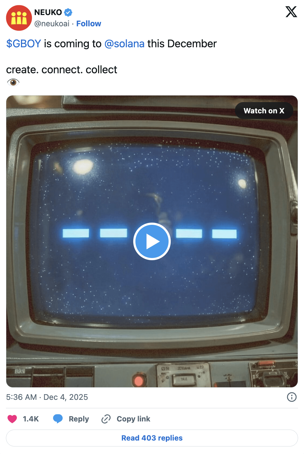 Le studio d'art et d'intelligence artificielle Neuko, connu pour ses illustrations de GBOY, a annoncé que le token GBOY sera émis en décembre sur la blockchain Solana, le studio a également publié une brève note concernant “gboyspecial” ainsi qu'une adresse de portefeuille Solana.