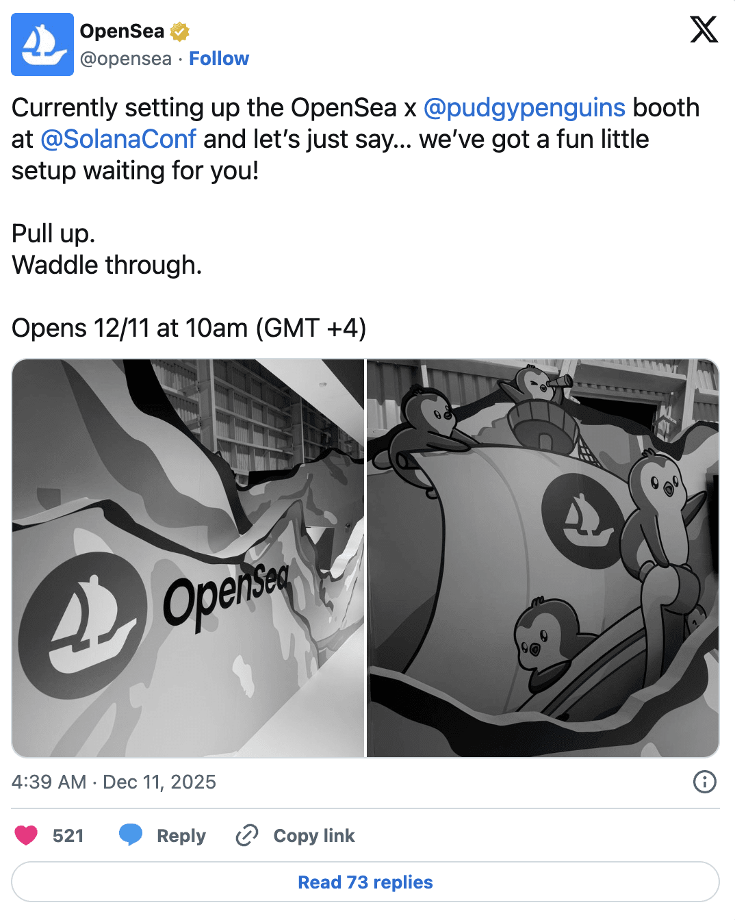 OpenSea et Pudgy Penguins ont lancé pour la première fois un stand conjoint à Solana Breakpoint.
