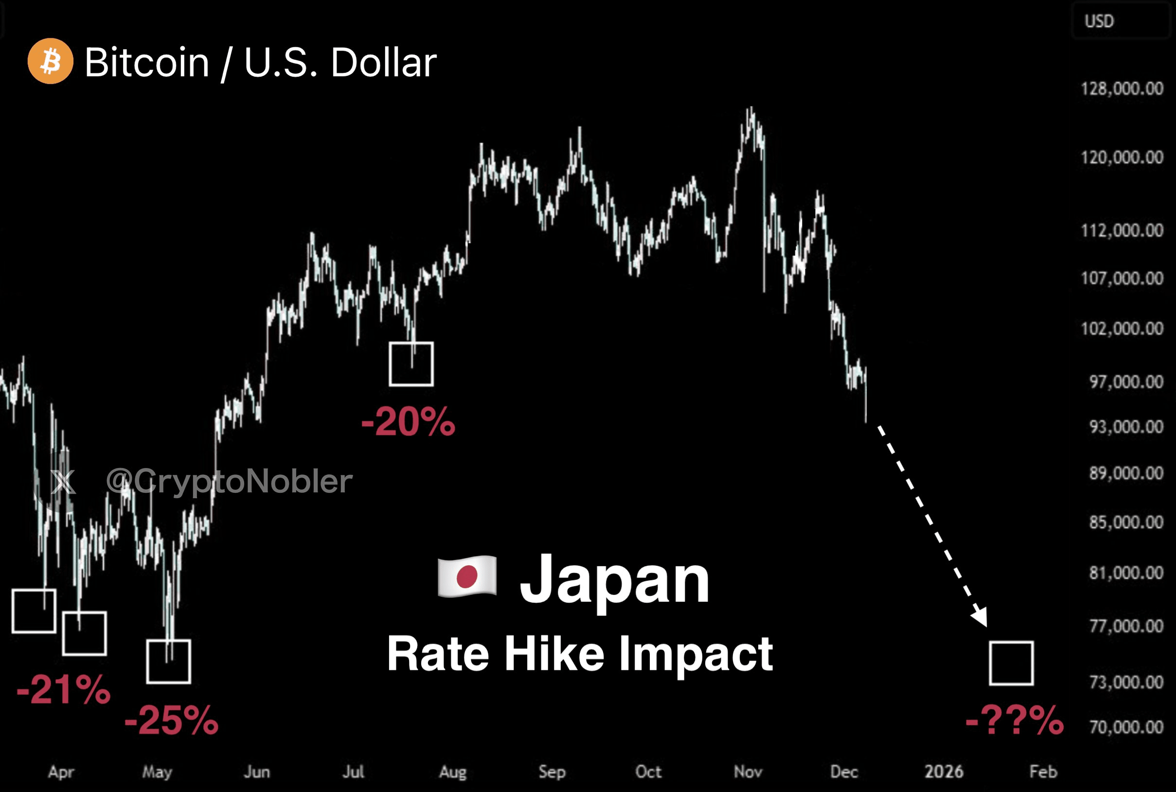 🚨 CHAQUE FOIS QUE LE JAPON AUGMENTE LES TAUX, LE BITCOIN CHUTE DE 20 À 25 %