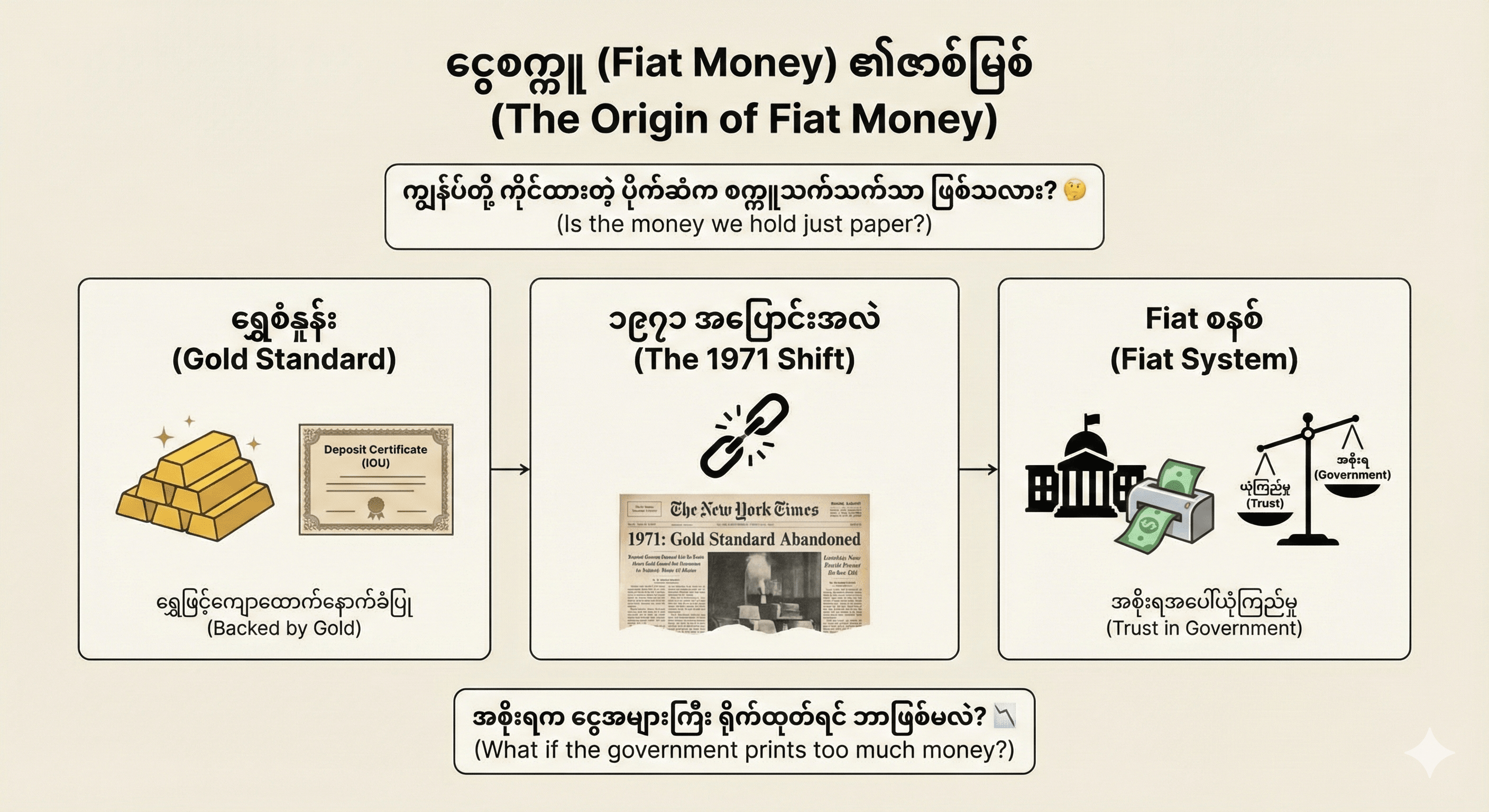 Avant 1971, chaque dollar était garanti par de l'or véritable. Mais après 1971, les pays du monde ont abandonné la "standard-or" et ont adopté un système monétaire basé sur la force et l'autorité du gouvernement, appelé "monnaie fiduciaire".